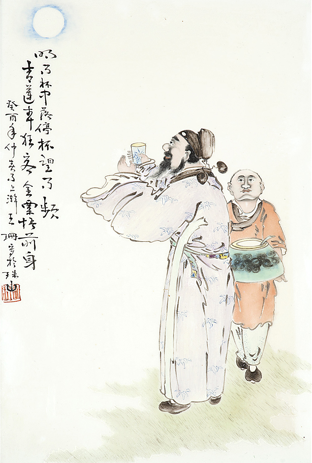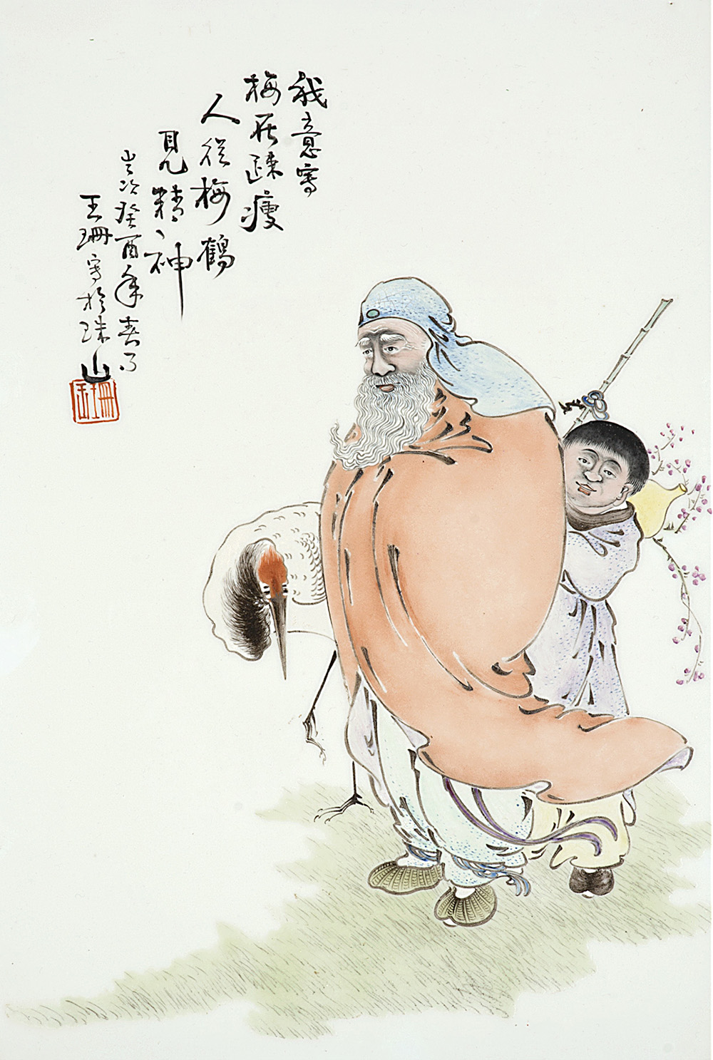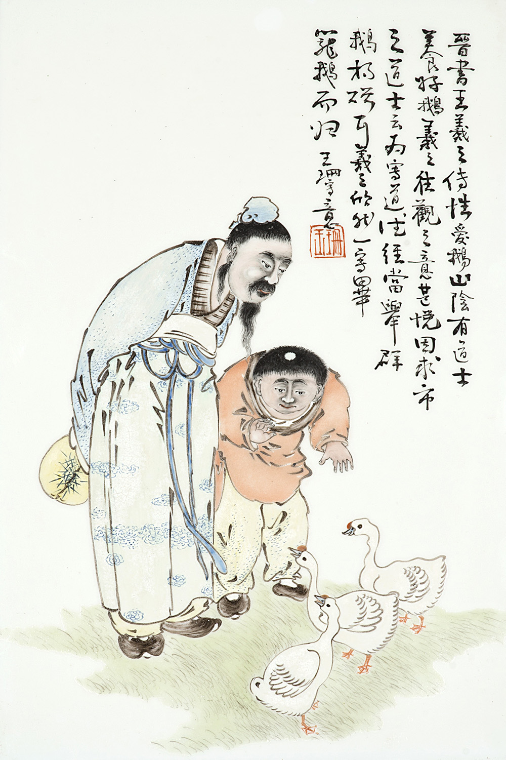 Four porcelain plaques decorated in polychrome enamels with legendary figures, calligraphy and seals by the artist Wang Shan, wood frames