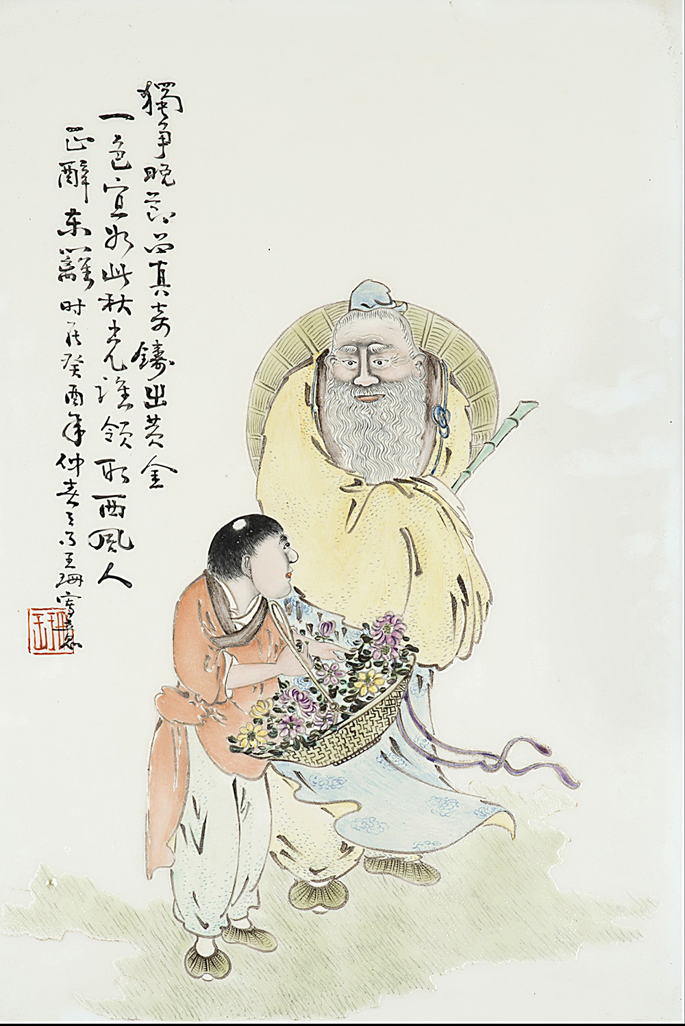 Quattro placche in porcellana a smalti policromi con figure leggendarie, con calligrafia, firma e sigilli dell'artista Wang Shan, con cornici in legno