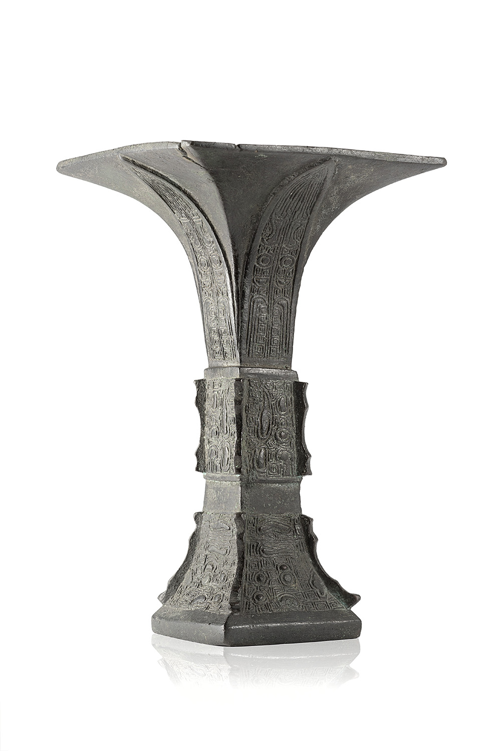 A bronze vase of archaistic form fanggu decorated with applied geometric motifs (defects)