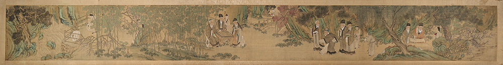 Scroll orizzontale ad inchiostro e colori su seta raffigurante "Saggi nella foresta di bambù", con firma apocrifa Jiao Bingzhen (difetti)