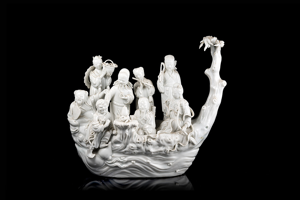 Gruppo in porcellana Blanc-de-Chine raffigurante Immortali taoisti su zattera