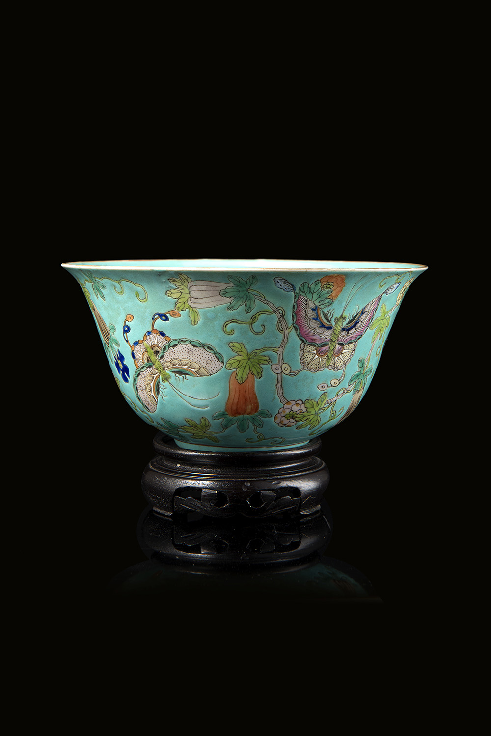 A turquoise-ground Famille Rose bowl decorated with butterflies amongst flowers and fruiting branches, with apocryphal Jiaqing mark, wood base