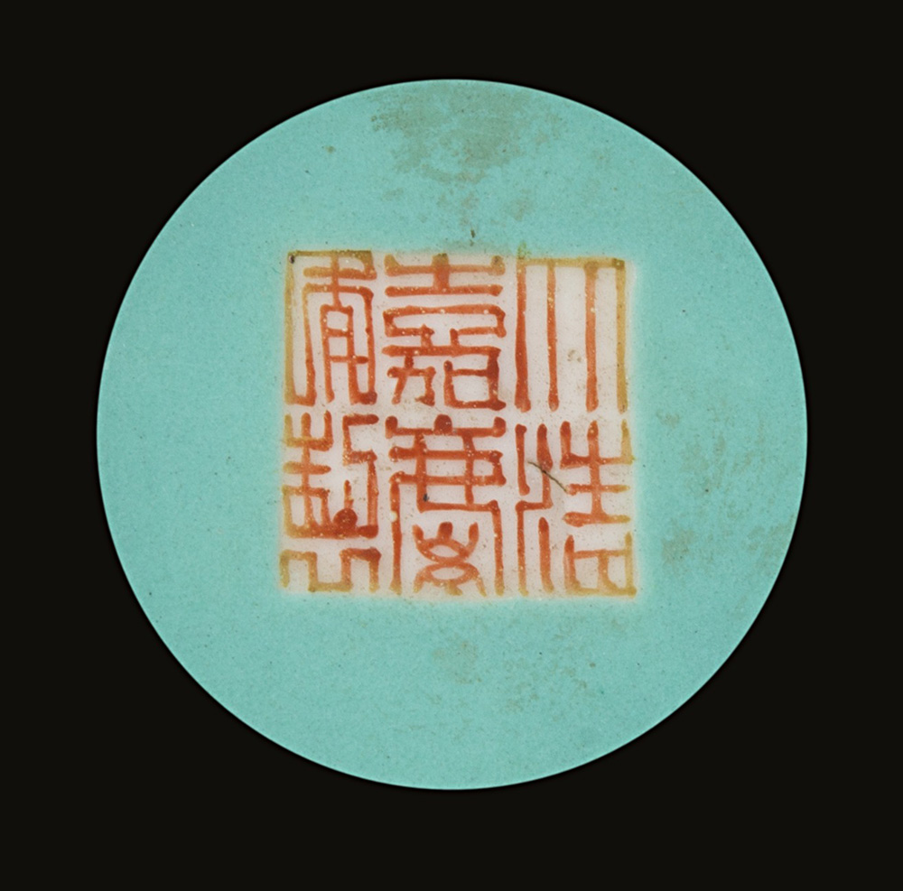Ciotola in porcellana Famiglia Rosa su fondo turchese, decorata con farfalle tra rami con fiori e frutti, marchio apocrifo Jiaqing, base in legno