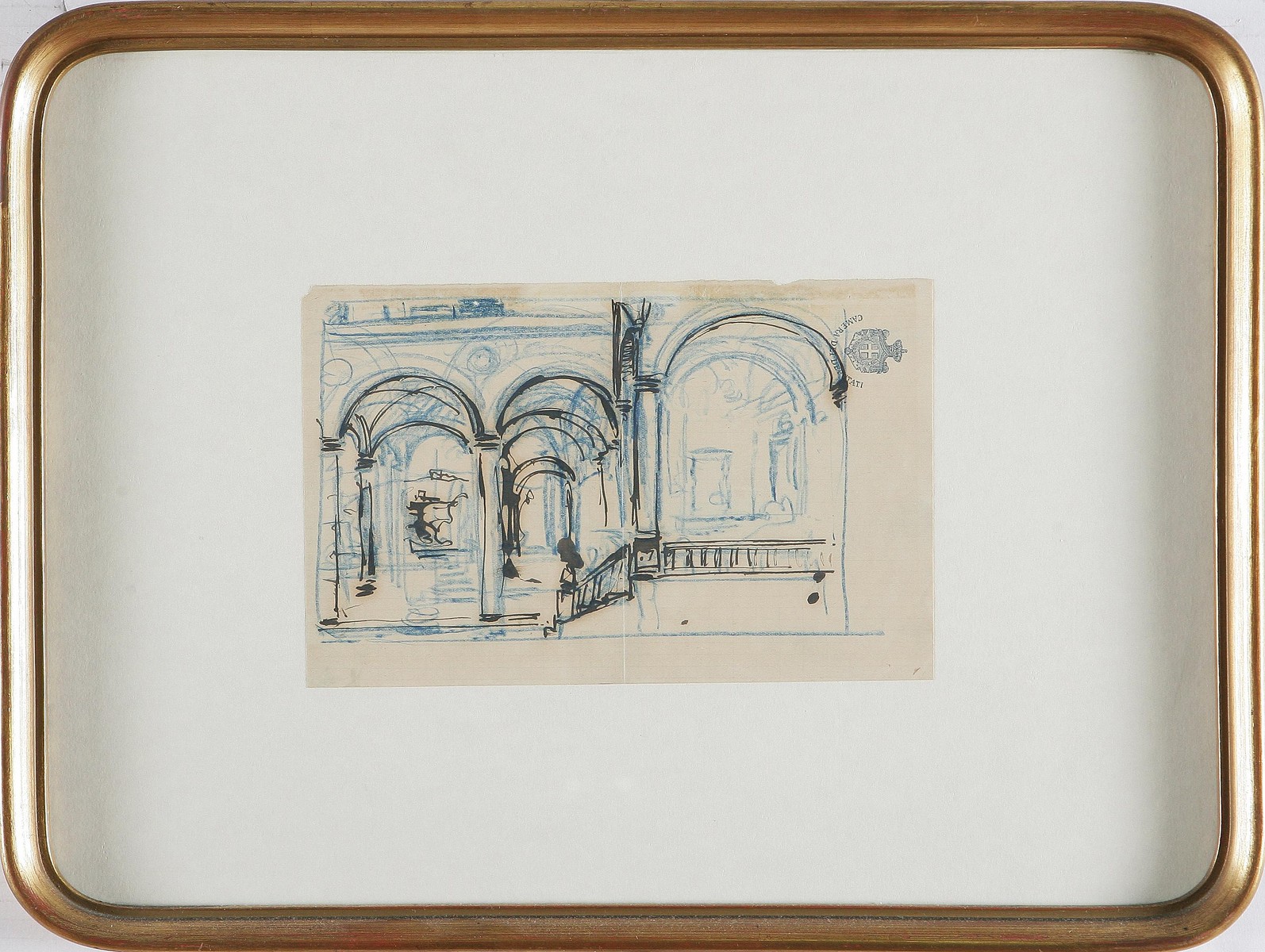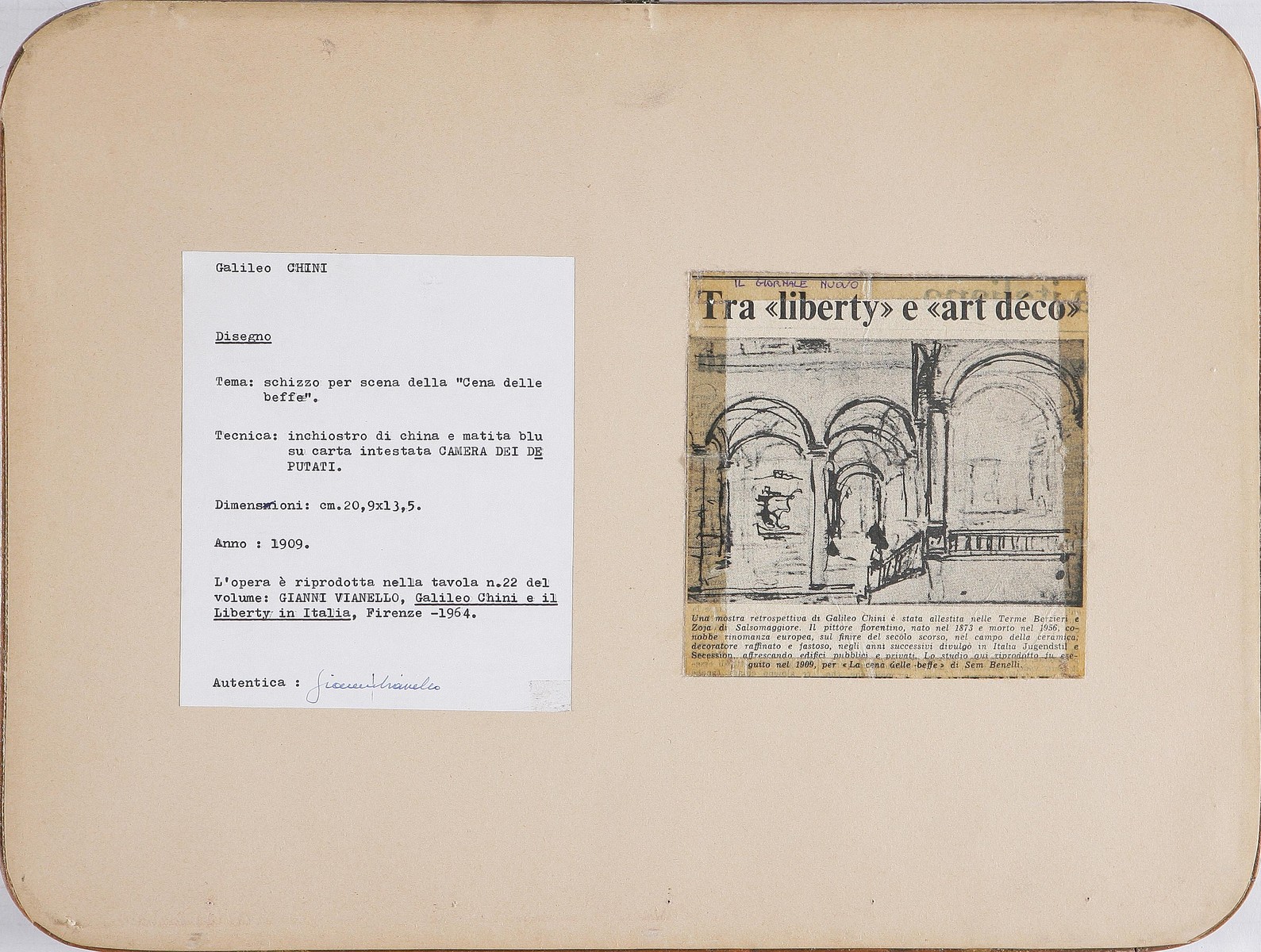 CHINI GALILEO (1873 - 1956) Schizzo per scena della -Cena delle beffe-. 1909. China e matita su carta. Cm 13,5x20,9. Certificato di autenticità a cura della Galleria D'arte Il Calligramma, Busto Arsizio. Carta intestata -Camera dei Deputati-. Al retro cartiglio descrittivo controfirmato da Gianni Vianello per autentica; l'opera è riprodotta alla tavola n.22 del volume: Gianni Vianello, Galileo Chini e il Liberty in Italia, Firenze, 1964. Cornice presente.