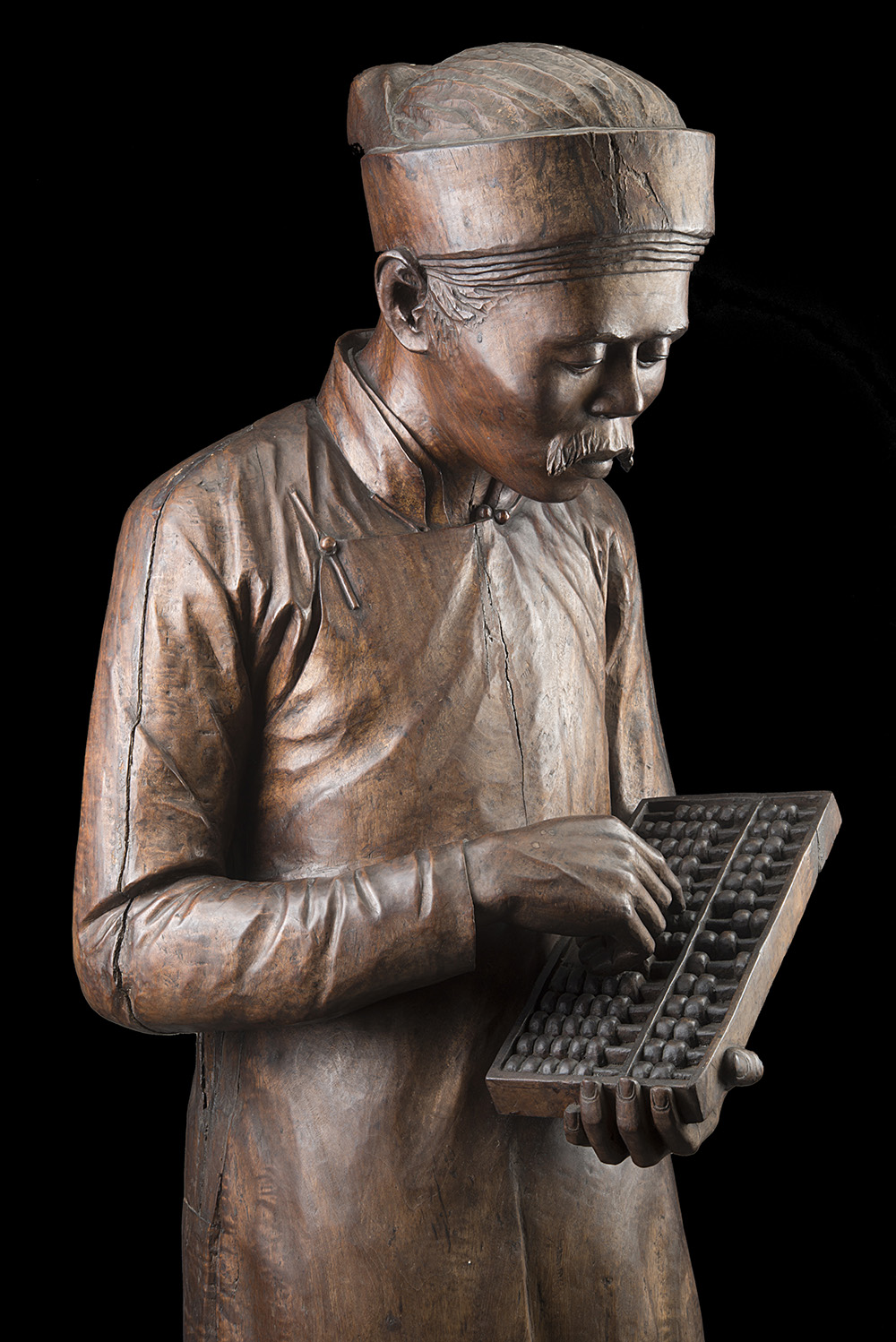Scultura in legno 'nanmu' raffigurante mercante, vestito con casacca lunga e pantaloni, il capo coperto, tra le mani un abaco, sulla base decorata a motivi geometrici è intagliato al centro l'ideogramma 'shang' che in cinese tradizionale corrisponde a 'mercante, uomo d'affari'