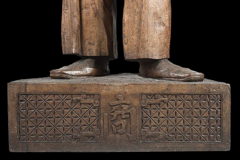A 'nanmu' wood sculpture of a merchant, wearing a long blouse and trousers, the head covered, an abacus held in the hands, the base decorated with geometric motifs, carved with a central character 'shang' corresponding to 'merchant, business man'