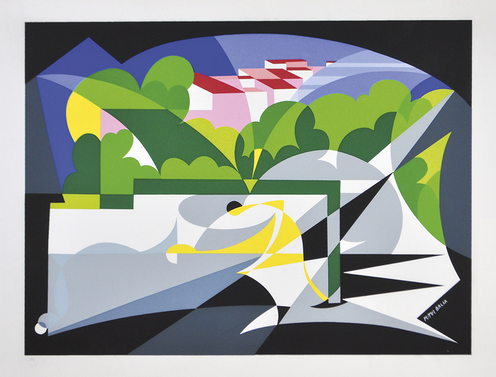 Giacomo Balla (Turin/Torino 1871 – Rom/Roma 1958) Tennis + paesaggio o giocatrice di tennis, 1920/1982;Serigrafia a col., 40,5 x 54 cm, tirata su carta Giotto della Cartiera Magnani di Pescia in 250 esemplari numerati da 1 a 250 e 30 esemplari numerati da I a XXX, stamperia Area Studio di Milano nel dicembre 1982, a cura della Galleria
