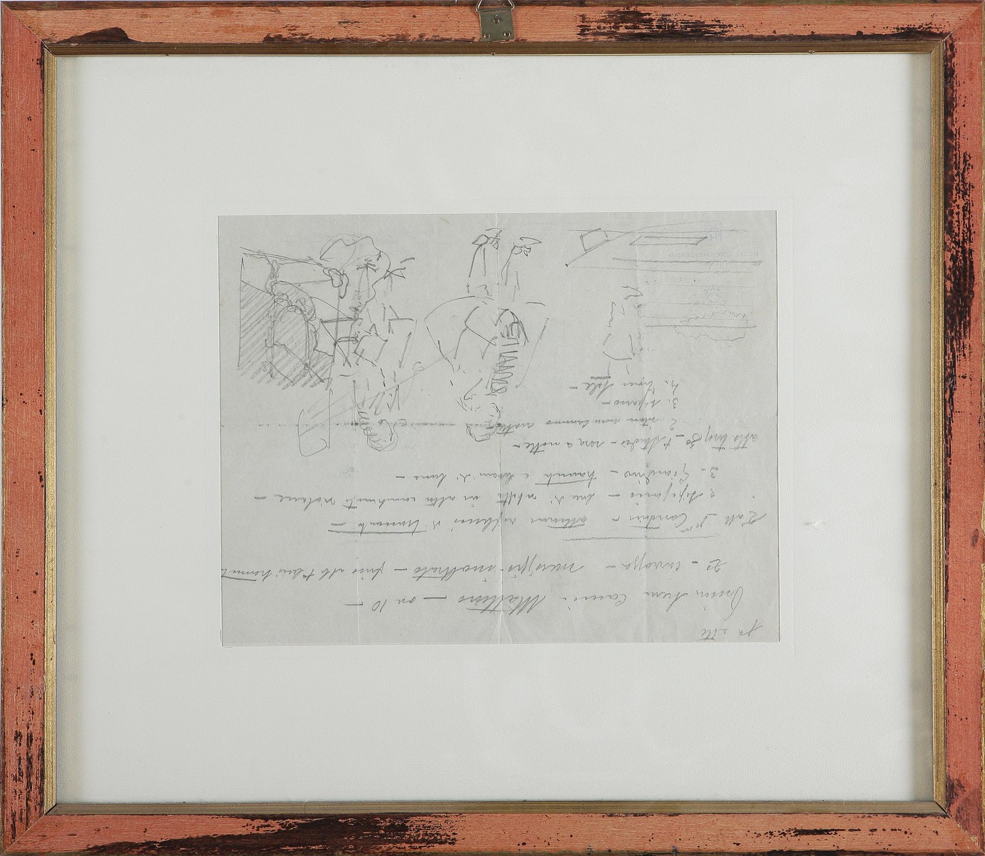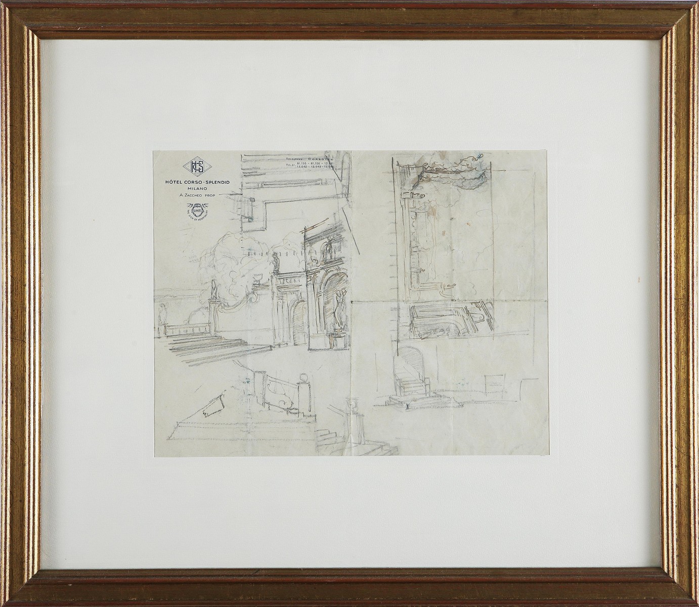 CHINI GALILEO (1873 - 1956) Studio di scene per l'opera Cenerentola. 1936. Matita su carta. Cm 28x21,5. Certificato di autenticità a cura di Gianni Vianello. L' opera è stata eseguita su carta intestata Hotel Corso Splendid, Milano. Al retro annotazioni autografe di Gallileo Chinie studio di costumi per l'opera. Cornice presente.