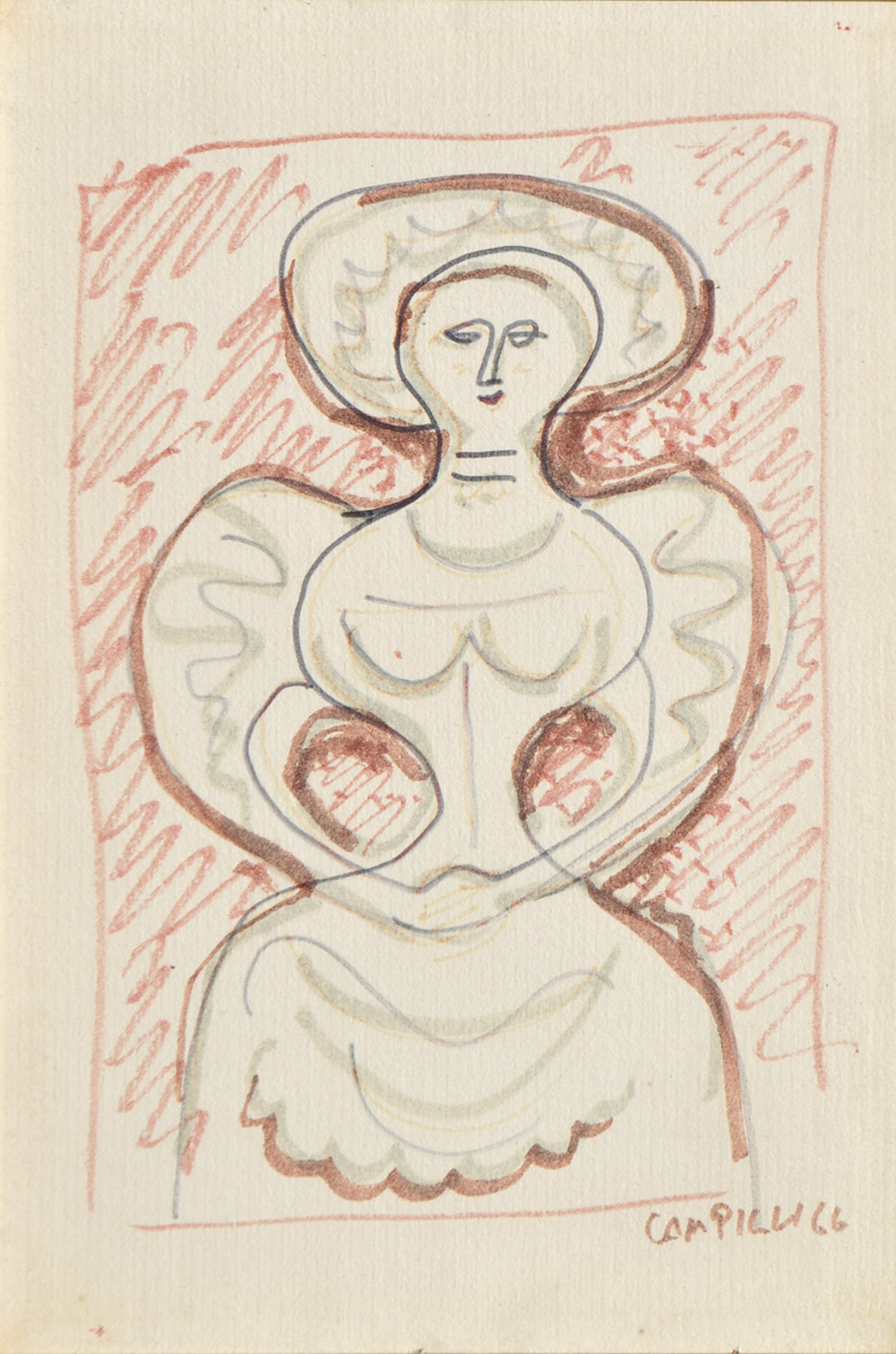 Massimo Campigli (Berlin/Berlino 1895 – Saint-Tropez 1971) Figura di donna, 1966;Acquarello, pennarelli su carta applicata su tela, 28,5 x 19 cmFirma e data, al retro timbri Galleria Il Navig-lio Milano, Galleria Antenore, F.lli Orler Fava-ro Veneto, iscrizione a pennarello 66/4Provenienza: Galleria Flli Orler Favaro Vene-to, collezione privata Trento
