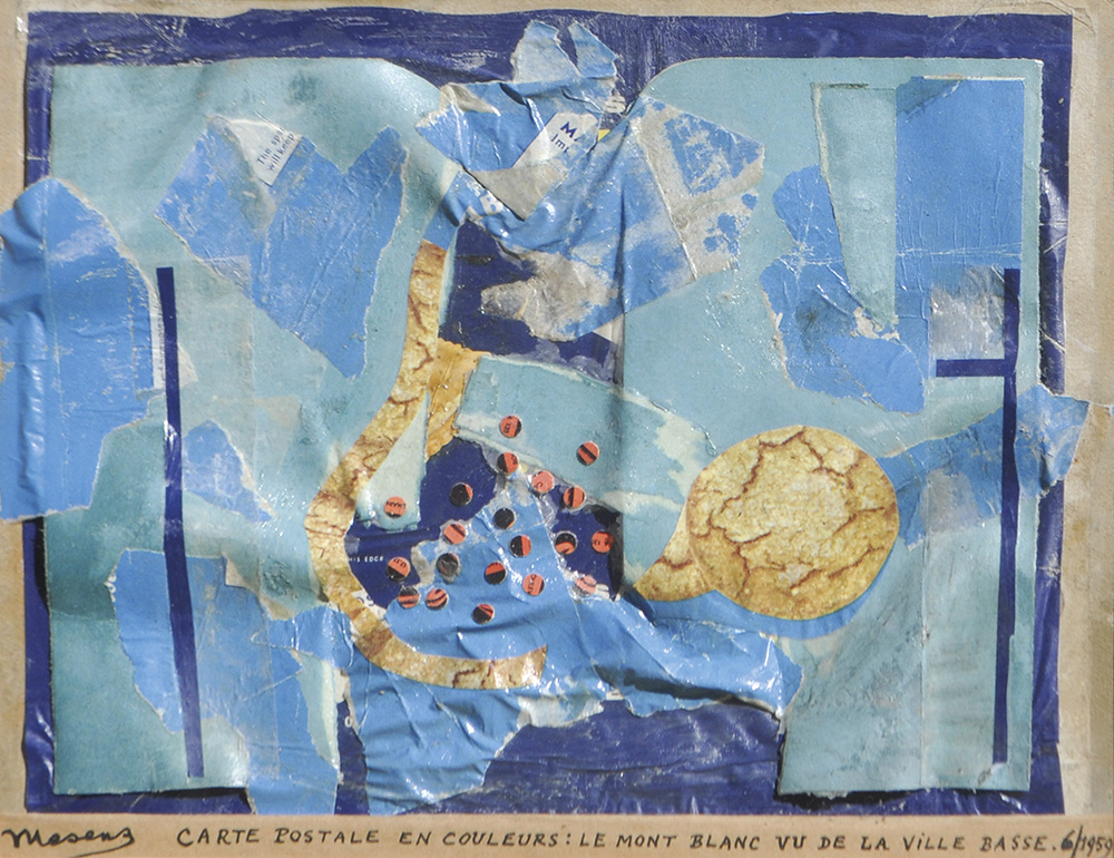 Edouard Lèon Théodore Mesens (Brüssel/Bruxelles 1903 – 1971) Carte postale en couleurs,1959;le mont Blanc vu de la ville basse, Collage su cartoncino, 22 x 28 cm, al retro etichetta Galleria d’Arte del Naviglio Milano
