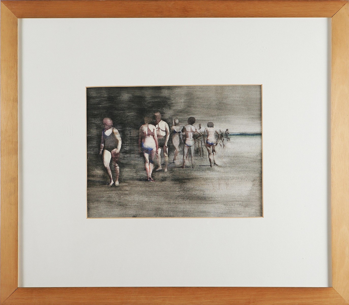BOSCHI DINO (n. 1923) Spiaggia. Acquarello su carta. Cm 29x40. Provenienza: Galleria Bambaia, Busto Arsizio; Collezione Dall'Oca. Al retro cartiglio della Galleria Bambaia, Busto Arsizio, controfirmato da Gianluigi Rebesco per autentica. Cornice presente.