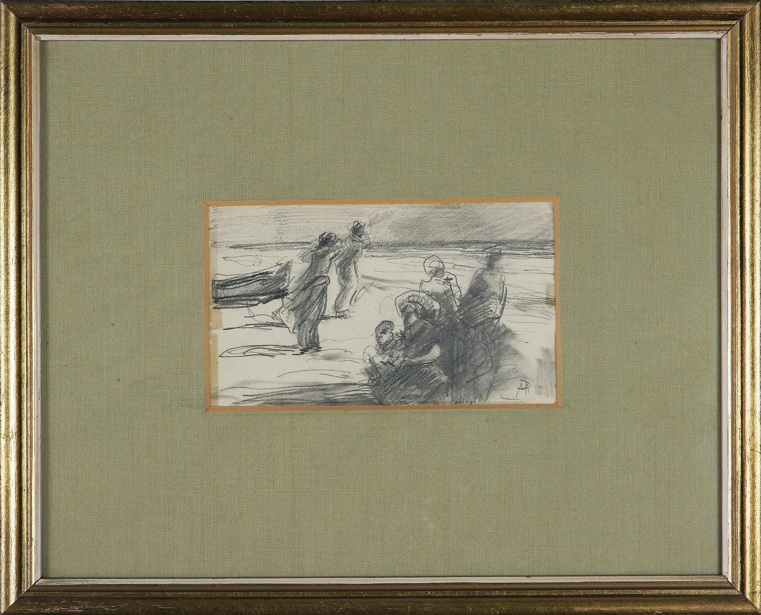 MARIANI POMPEO (1857 - 1927) Sulla spiaggia. Matita su carta. Cm 16,8x10,3. Provenienza: Galleria Cocorocchia, Milano Al retro firma e timbro dello Studio Pompeo Mariani, Bordighera. Monogrammato in basso a destra. Cornice presente.