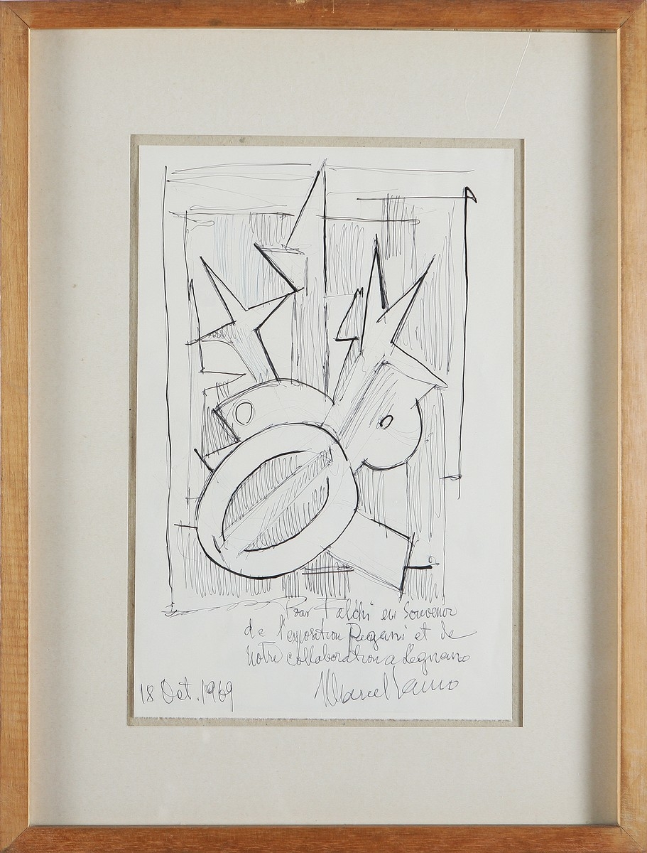JANCO MARCEL (1895 - 1984) Senza titolo. 1969. Tecnica mista su carta. Cm 19,5x29,5. L'opera è stata eseguita su carta intestata della Fondazione Pagani. Dedica al pittore Ettore Falchi e firma in basso a pennarello. Provenienza: Collezione Balansino; Collezione Dall'oca. Dedica, firma e data in basso a biro. Cornice presente.