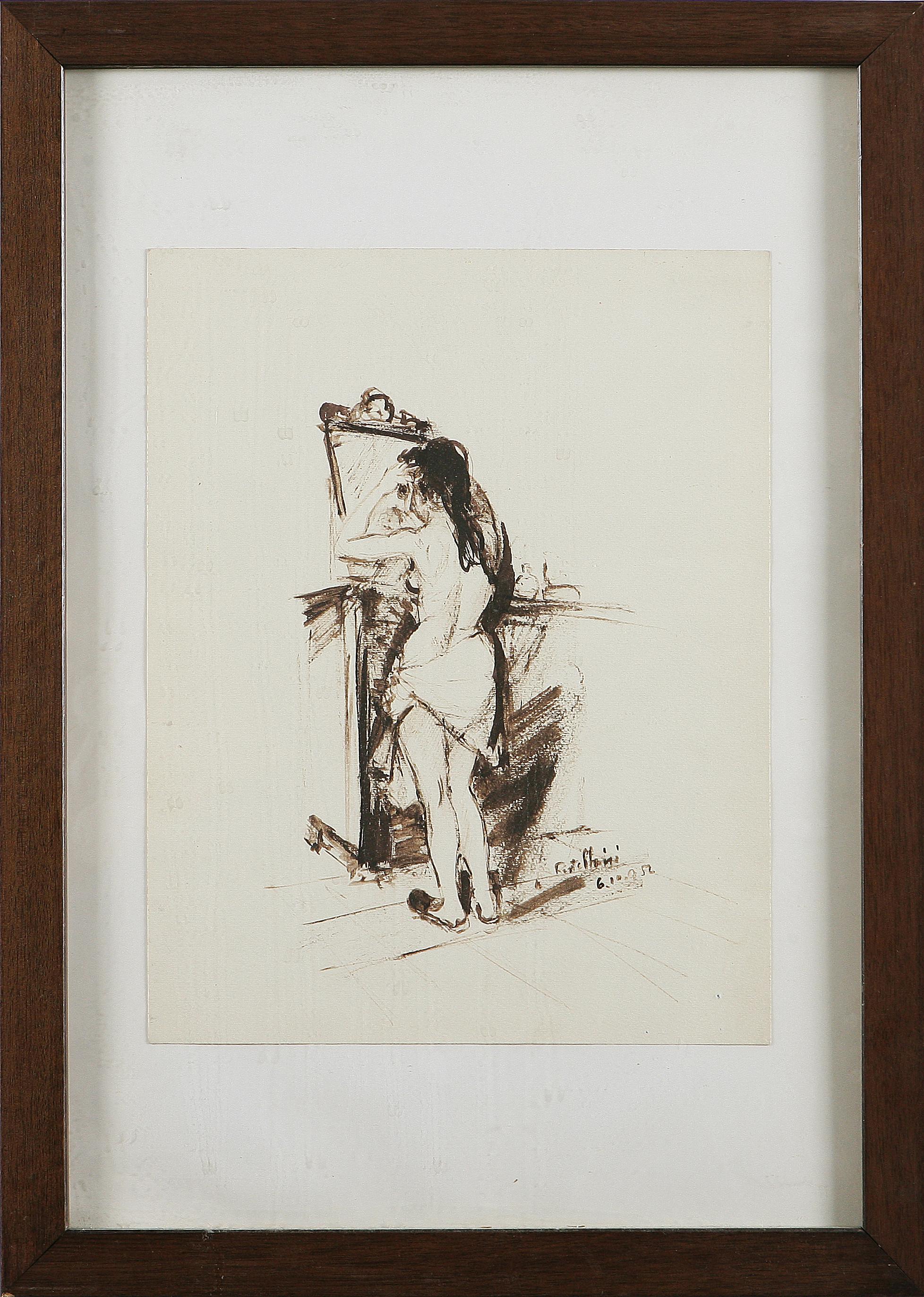 RESTELLINI GIAN PIETRO (1895 - 1978) Donna allo specchio. 1952. China su carta. Cm 26x33,5. Firma e data in basso a destra. Cornice presente.