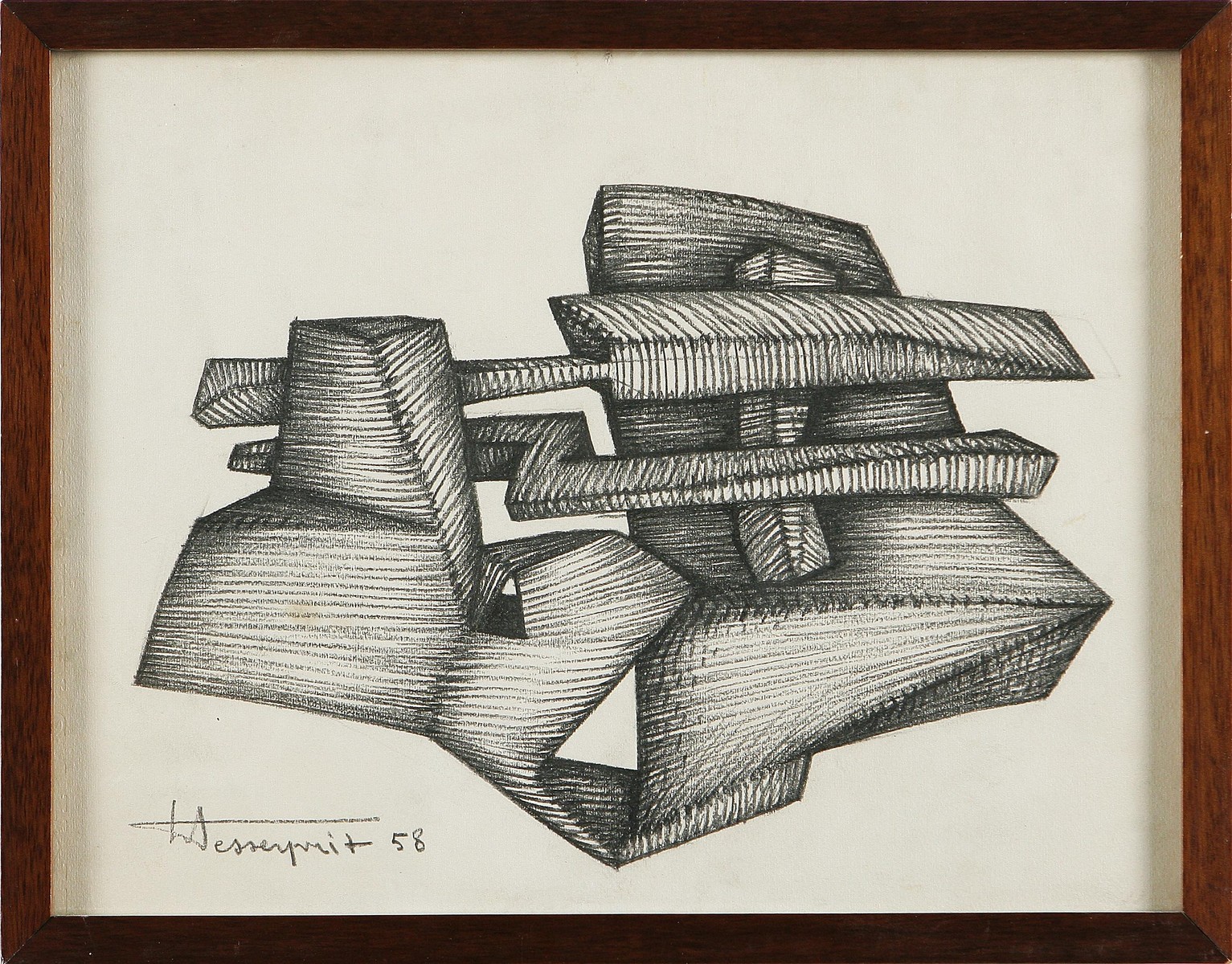 DESSERPRIT ROGER (1923 - 1985) Senza titolo. 1958. Matita su carta. Cm 30,5x23,5. Autentica su fotografia a cura della Galleria L'Angolo Del Collezionista, Legnano, controfirmata da Giancarlo Balansino. Firma e data in basso a sinistra. Cornice presente.