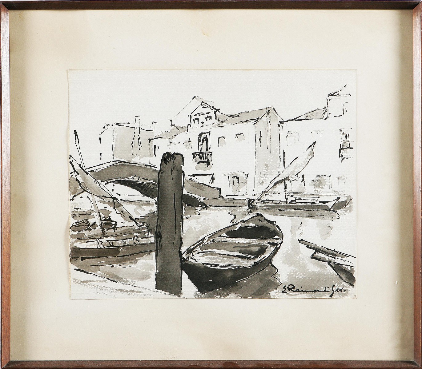 RAIMONDI SEVESO LUIGI Chioggia. Acquarello e china su carta. Cm 37,5x30. Al retro cartiglio descrittivo della Galleria La Tana, via Mistrangelo 7r., Savona. Firma in basso a destra. Cornice presente.