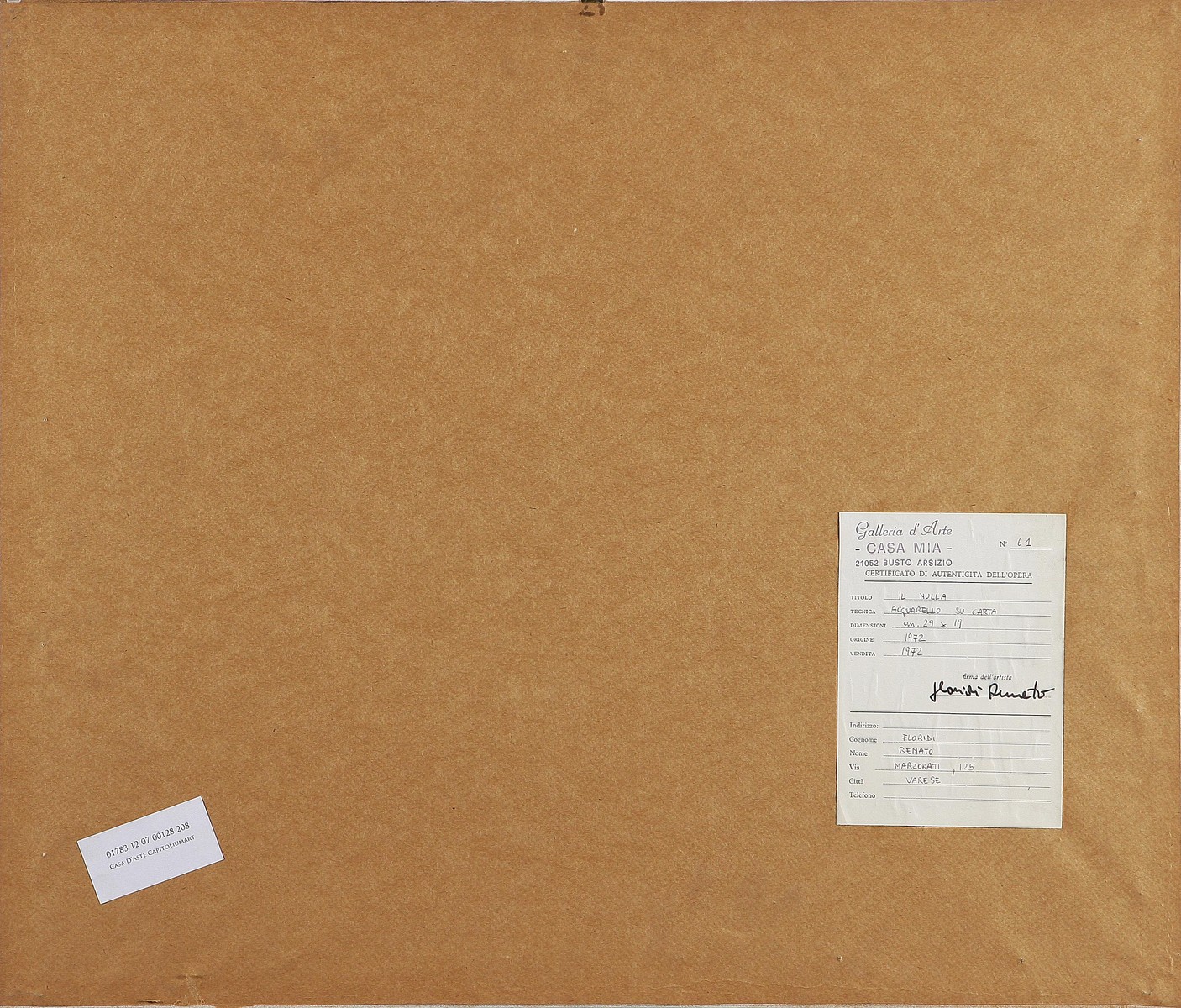 FLORIDI RENATO Il nulla. 1972. Acquarello su carta. Cm 28x19. Al retro cartiglio descrittivo della Galleria d'arte Casa Mia, Busto Arsizio, con firma dell'artista per autentica. Firma e data in basso a destra; titolo in basso a sinistra Cornice presente.