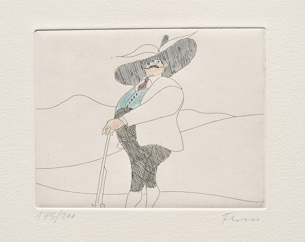 Paul Flora Glurns/Glorenza 1922 – Innsbruck 2003), Il petto gonfio d’orgoglio;Acquaforte colorata, 8,7 x 22,6 cm (lastra)