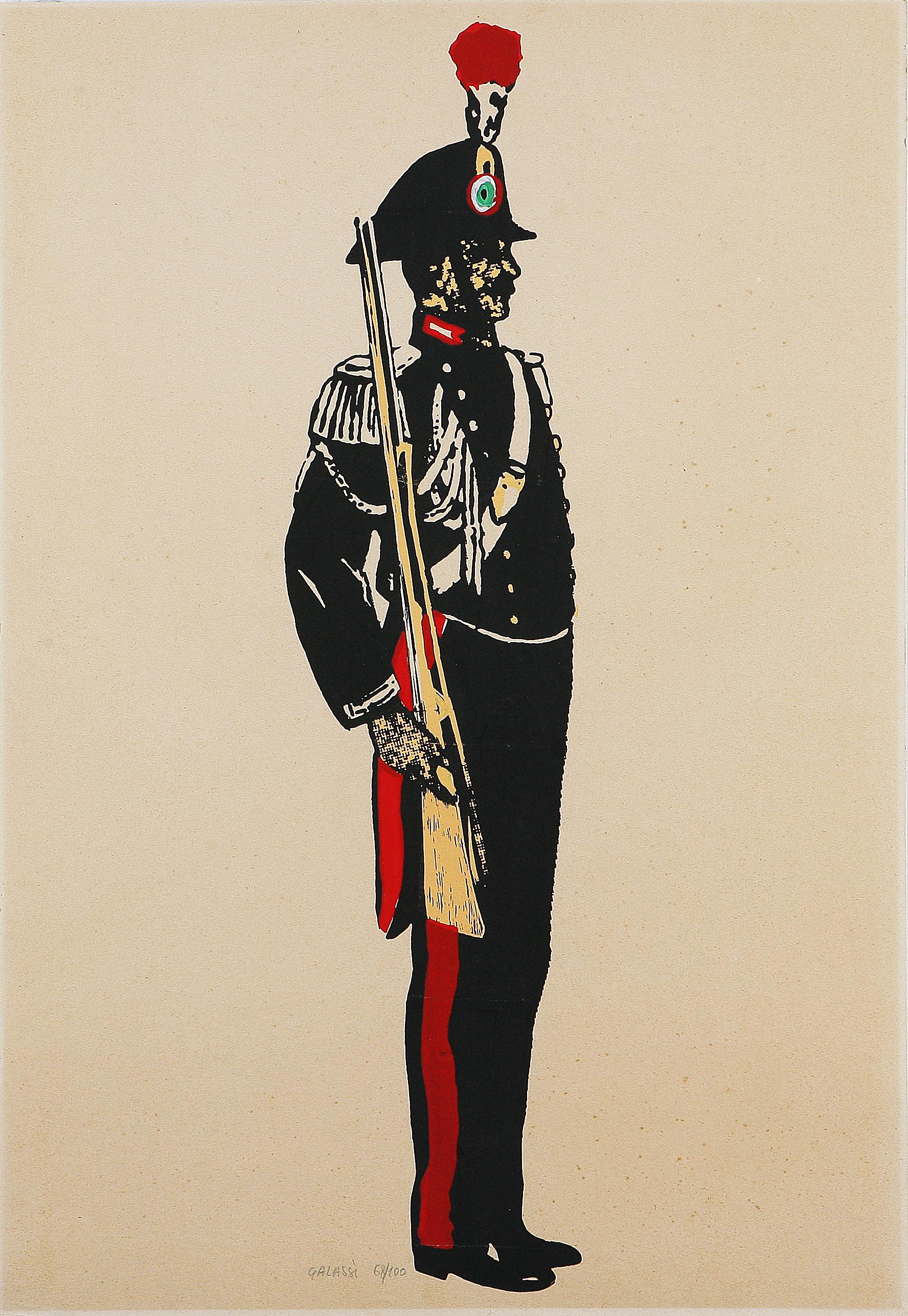 GALASSI Carabiniere in divisa. Acrilico su cartone. Cm 50x70. Misure disegno: 81,5 x 53,5 cm; tir. 68/100 in basso al centro a matita. Firma in basso al centro a matita.