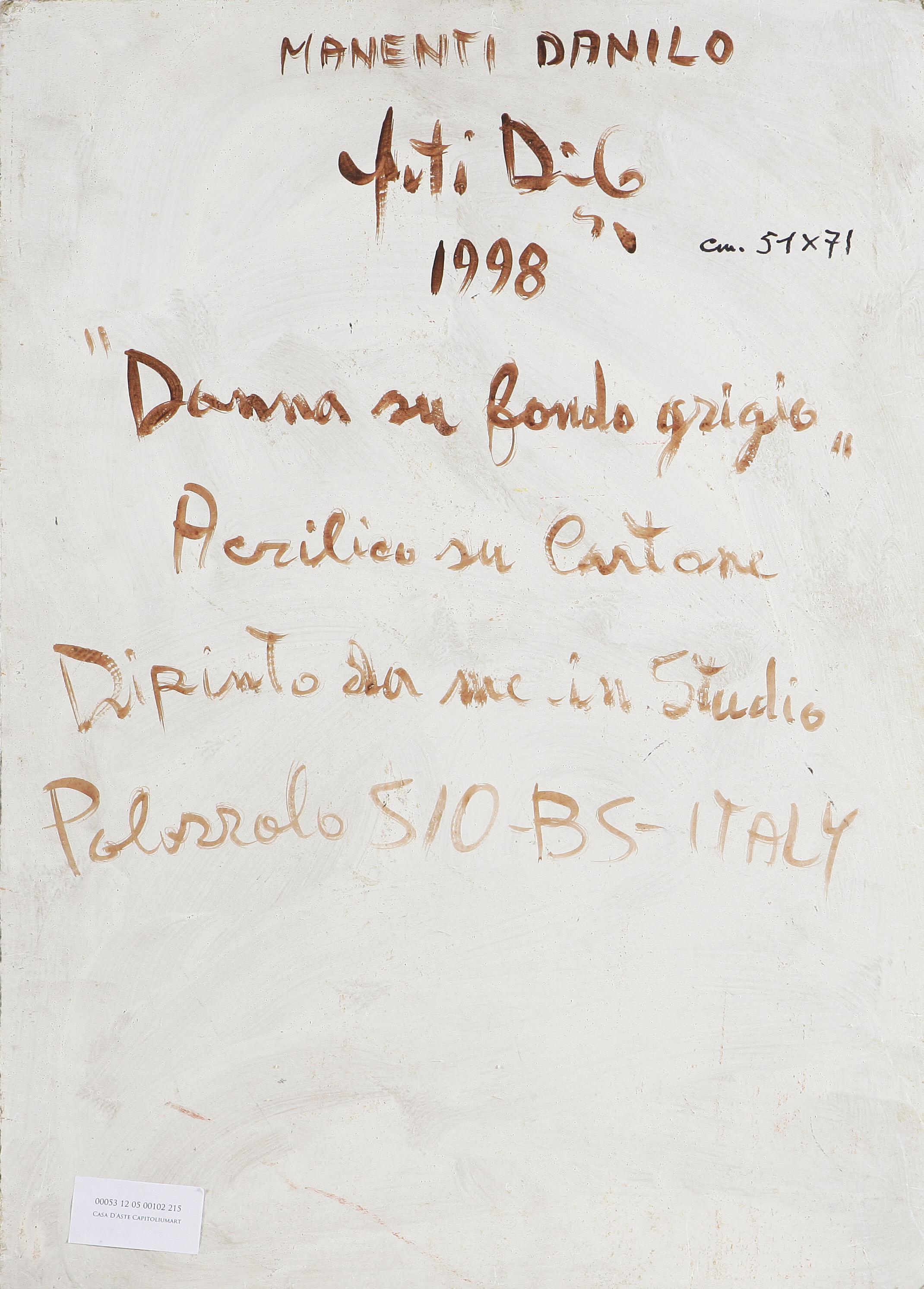 MANENTI DANILO (n. 1951) Donna su fondo grigio. Acrilico su cartone. Cm 71x51. Autentica dell'artista su fotografia. Al retro autentica dell'artista con relativo numero di repertorio. Firma in basso a destra.