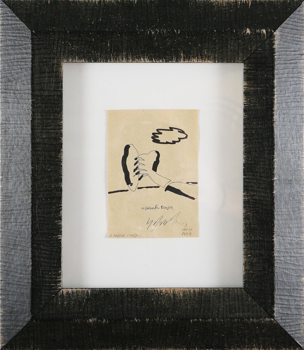 DANGELO SERGIO (n. 1932) Il sogno di BigJim. 1977. Tecnica mista su carta. Cm 15x11. Dedica in basso a sinistra. Firma e data in basso a destra. Cornice presente.