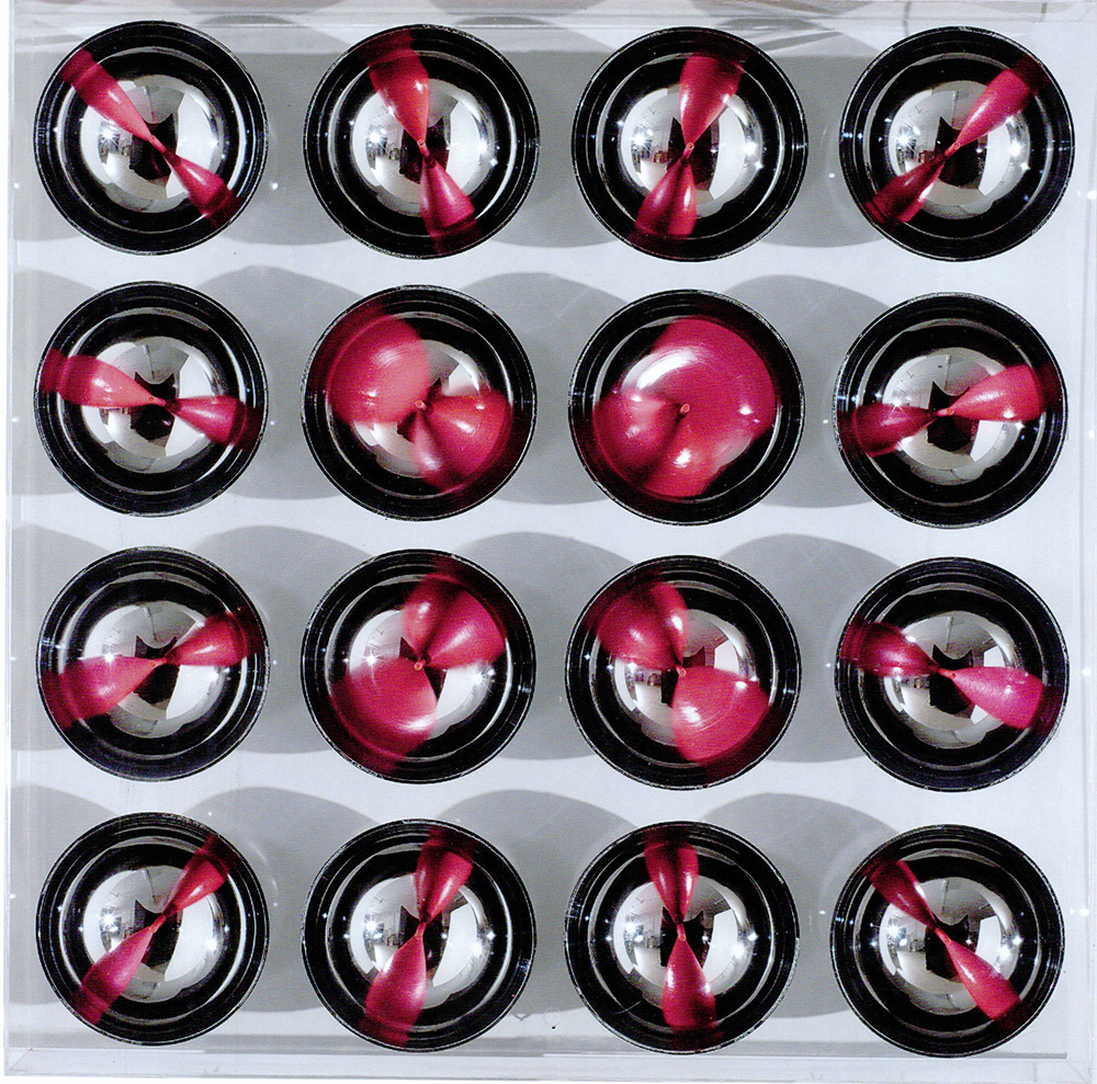 Costalonga Franco oggetto cromocinetico sedici sfere in metacrilato metallizzato e plexiglass trasparente 62,5x62,5x7,3 senza titolo firma e archivio n. OCM13 sul bordo inferiore , dichiarazione d'autenticità dell'artista su 2 foto