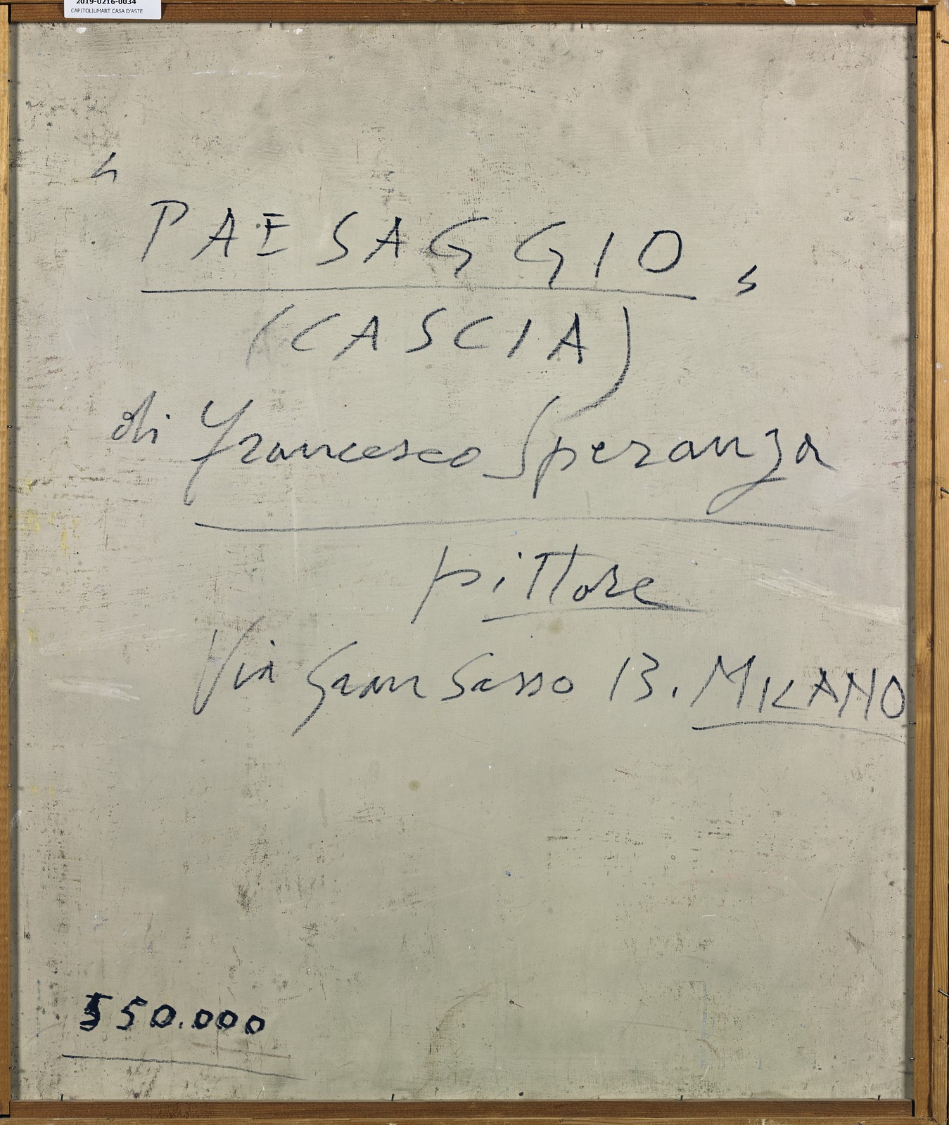 SPERANZA FRANCESCO (1902 - 1984) Paesaggio. 1952. Olio su tavola. Cm 50,00 x 60,00. Firma e anno in basso a destra. Al retro titolo e firma. Provenienza: eredità Inzoli, Brescia. Parte del ricavato verrà devoluto in beneficenza come da indicazioni testamentarie. Cornice presente