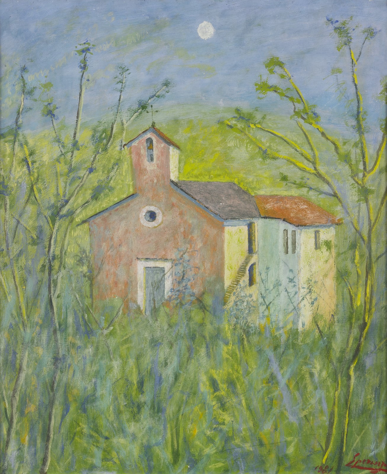 SPERANZA FRANCESCO (1902 - 1984) Chiesina di montagna. 1981. Olio su tela applicato su cartone. Cm 50,00 x 60,00. Firma e anno in basso a destra. Al retro titolo, firma e anno. Certificato di garanzia Galleria Le Arcate. Provenienza: eredità Inzoli, Brescia. Parte del ricavato verrà devoluto in beneficenza come da indicazioni testamentarie. Cornice presente