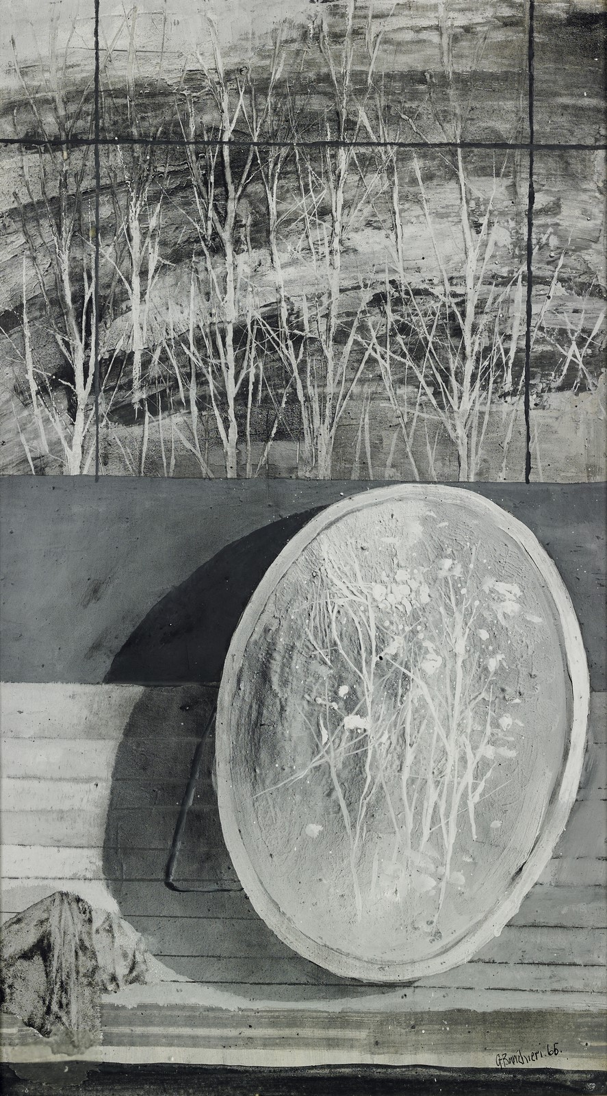 BANCHIERI GIUSEPPE (1927 - 1994) Senza titolo. 1966. Tecnica mista su tavola. Cm 60,00 x 30,00. Firma e anno in basso a destra. Provenienza: eredità Inzoli, Brescia. Parte del ricavato verrà devoluto in beneficenza come da indicazioni testamentarie. Cornice presente