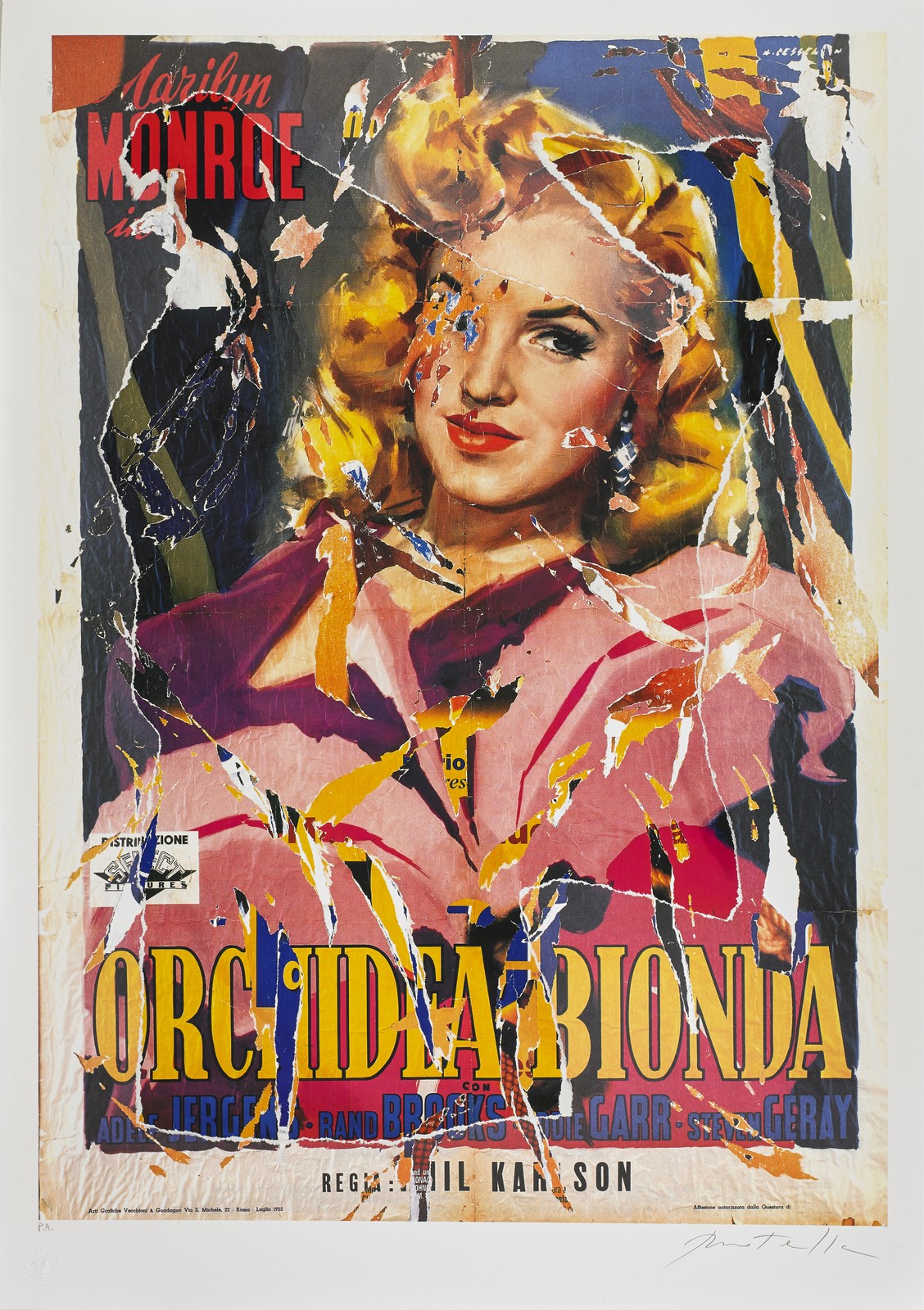 ROTELLA MIMMO (1918 - 2006) Orchidea bionda. Litodecollage. Cm 70,00 x 100,00. P.a. Tiratura e firma a matita in basso. Timbro a secco Fondazione Rotella, Milano in basso a sinistra. Pubblicazione: Mimmo Rotella - multiples décollages a cura di Elena Pontiggia, Silvana Editoriale, 2005, p. 80-81.