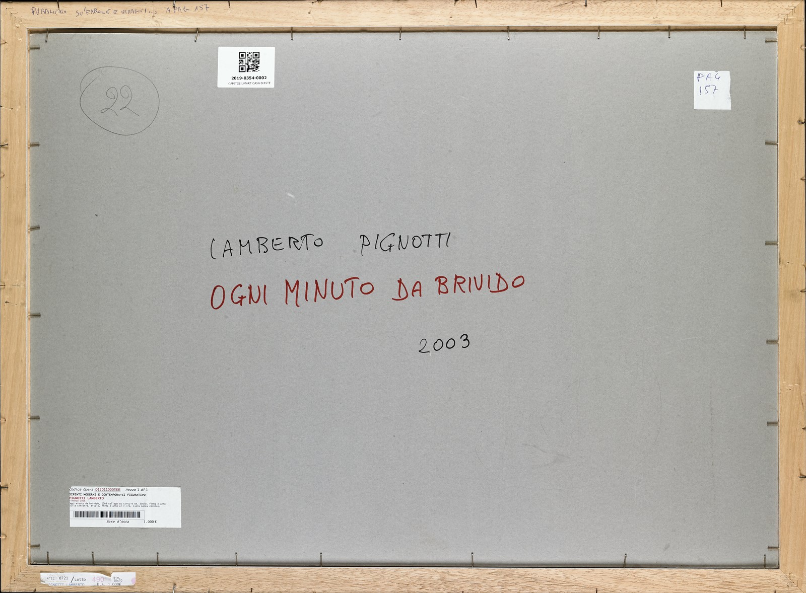 PIGNOTTI LAMBERTO (n. 1926) Ogni minuto da brivido. Tecnica mista e collage su cartone. Cm 70,00 x 50,00. Firma e anno in basso a sinistra. Al retro titolo, firma e anno. Cornice presente