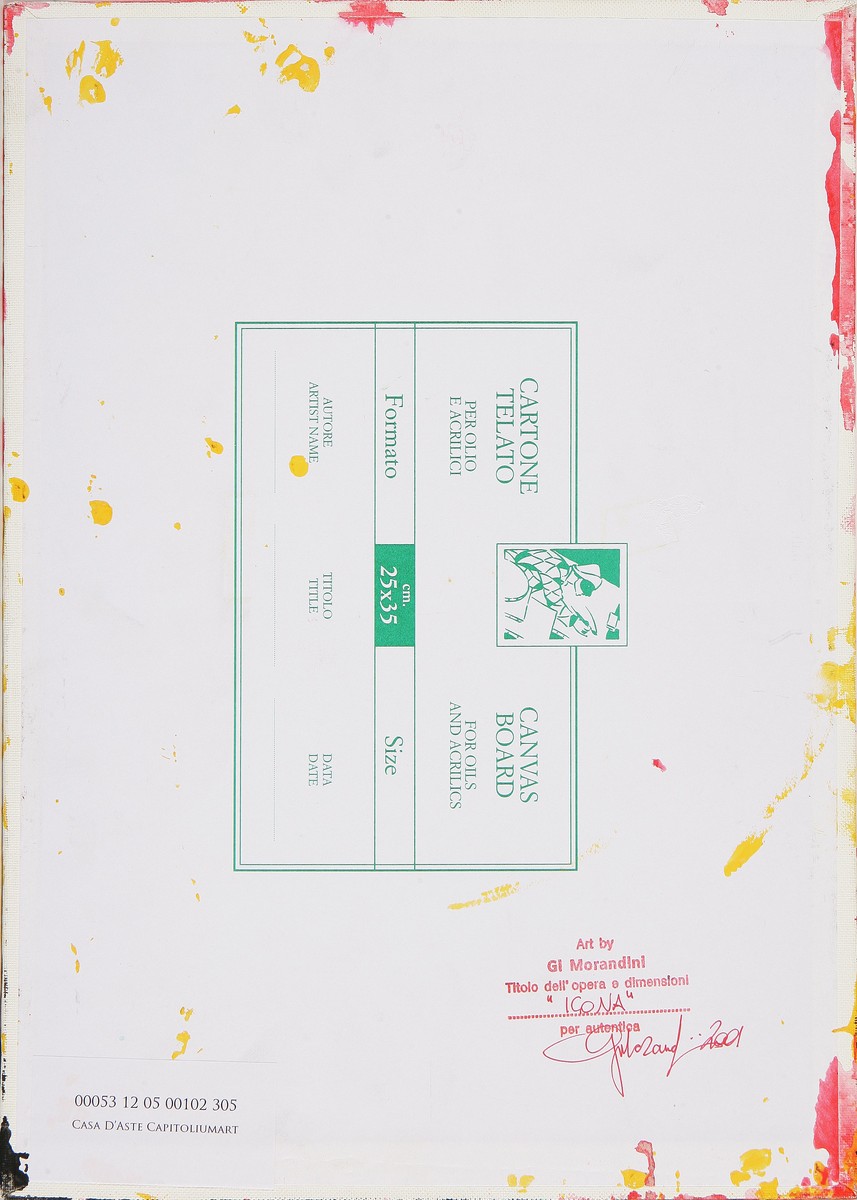 MORANDINI GI (n. 1951) Icona. 2001. Olio su cartone telato. Cm 25x35. Autentica dell'artista su fotografia. Al retro firma per autentica. Firma e data al centro dell'opera.