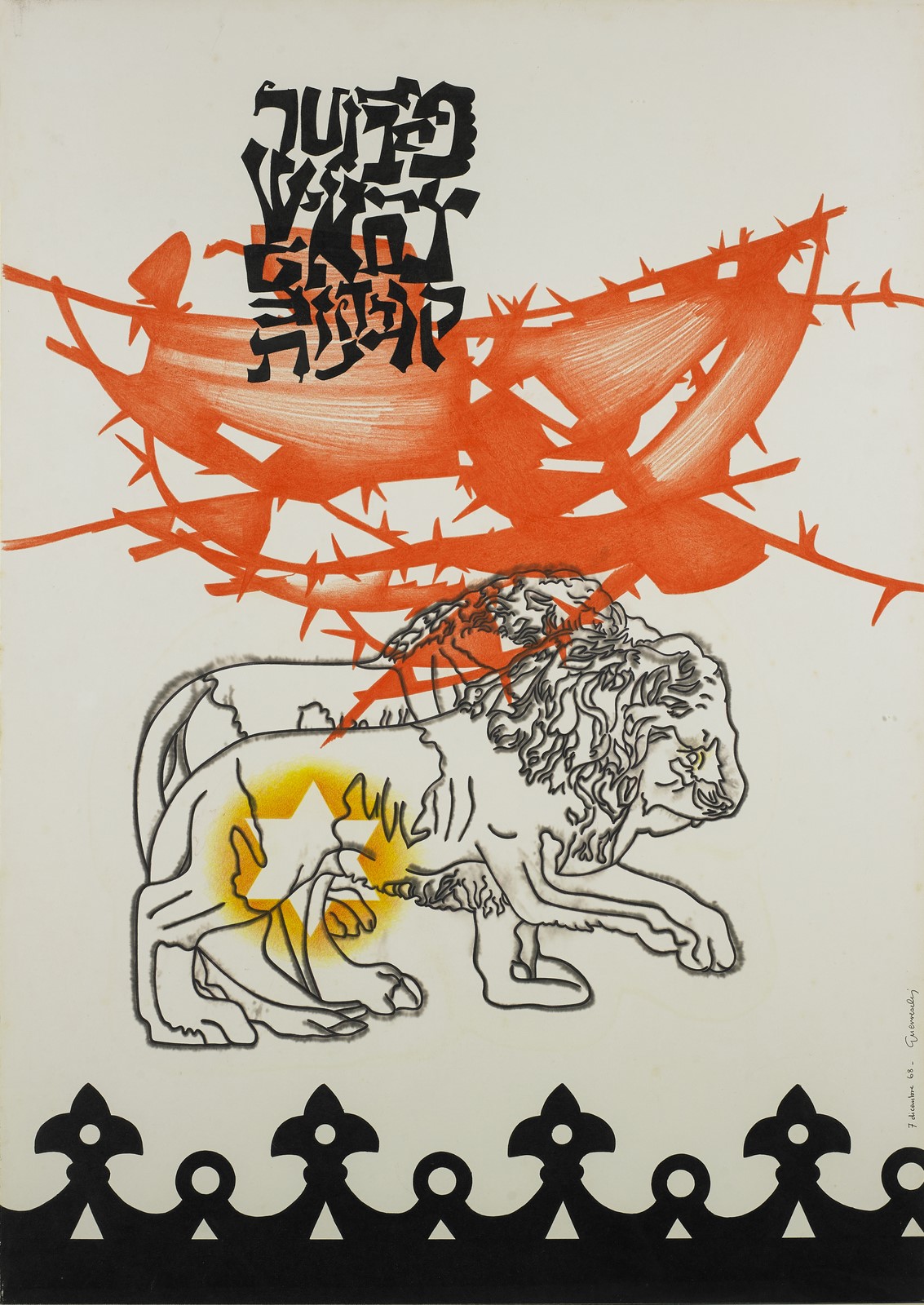 GUERRESCHI GIUSEPPE (1929 - 1985) Senza titolo. 1968. Tecnica mista su carta. Cm 70,00 x 100,00. Firma e anno in basso a destra. Pubblicazione: Giuseppe Guerreschi - Judaica a cura di Paolo Levi, Edizioni d'Arte Gianna Rossi Maggini, Pisa. Cornice presente