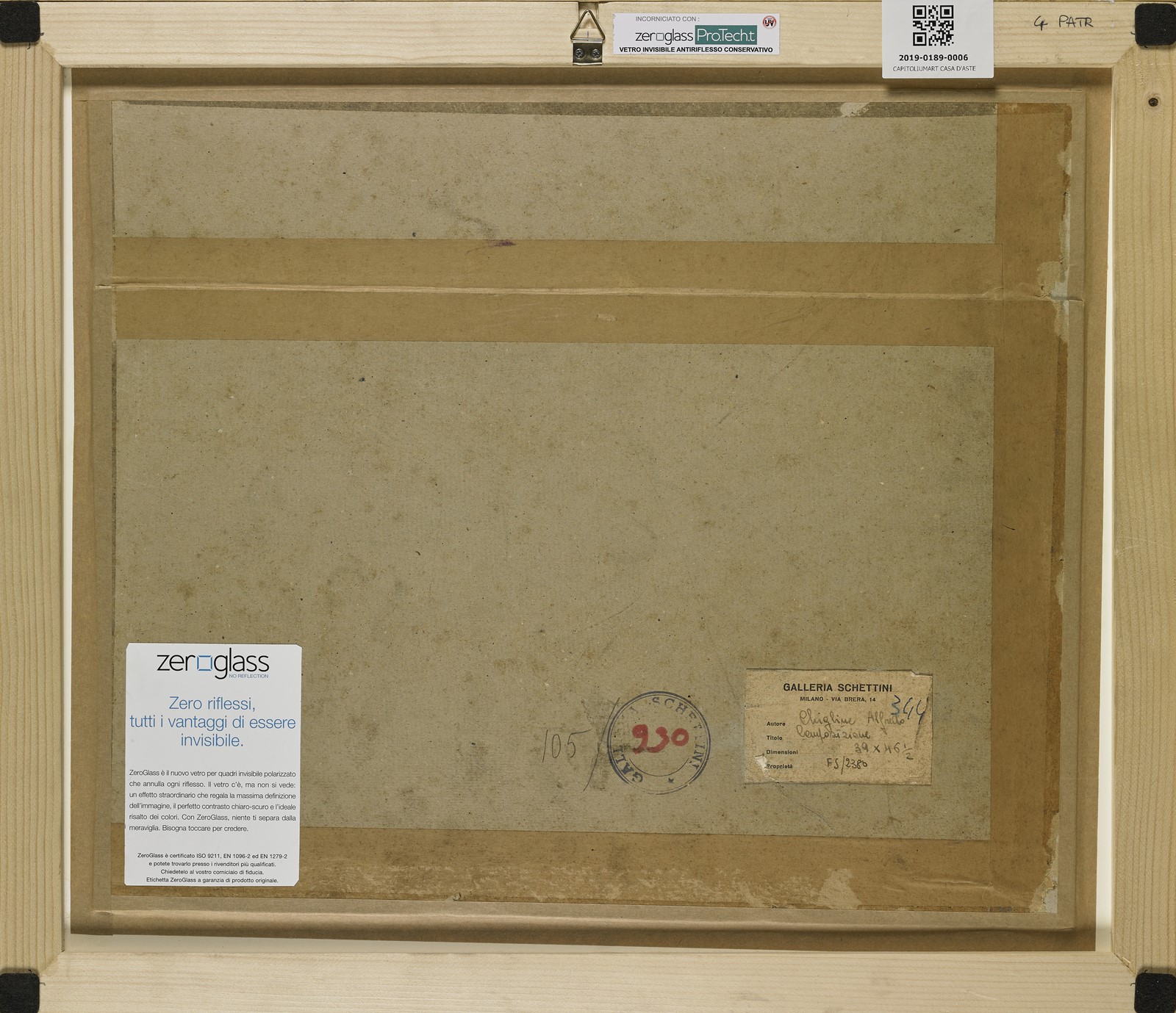 CHIGHINE ALFREDO (1914 - 1974) Composizione. 1951. Tecnica mista su carta. Cm 46,00 x 39,00. Firma e anno in basso a destra. Al retro cartiglio descrittivo e timbro della Galleria Schettini, Milano. Cornice presente
