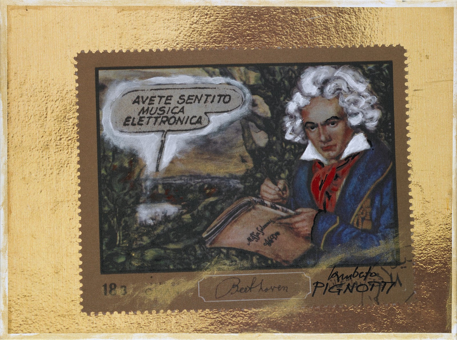 PIGNOTTI LAMBERTO (n. 1926) Avete sentito musica elettronica. Tecnica mista su tela. Cm 82,50 x 61,50. Firma in basso a destra. Autentica dell'artista su fotografia. Lamberto Pignotti. Parole, immagini e..., a cura di Valeria Dehò, Edizioni Gli Ori, pag. 193.