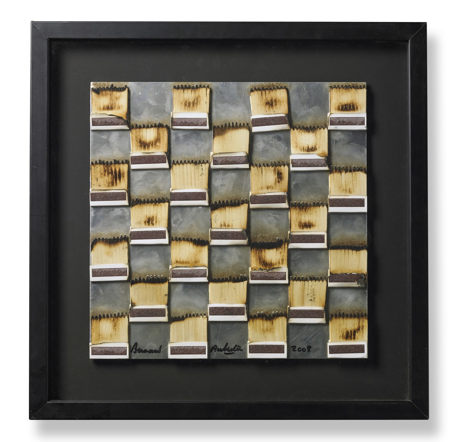 AUBERTIN BERNARD (1934 - 2015) Dessin de feu. . 2008. Fiammiferi su lamiera. Cm 30,00 x 30,00. Firma e anno in basso. . Cornice presente