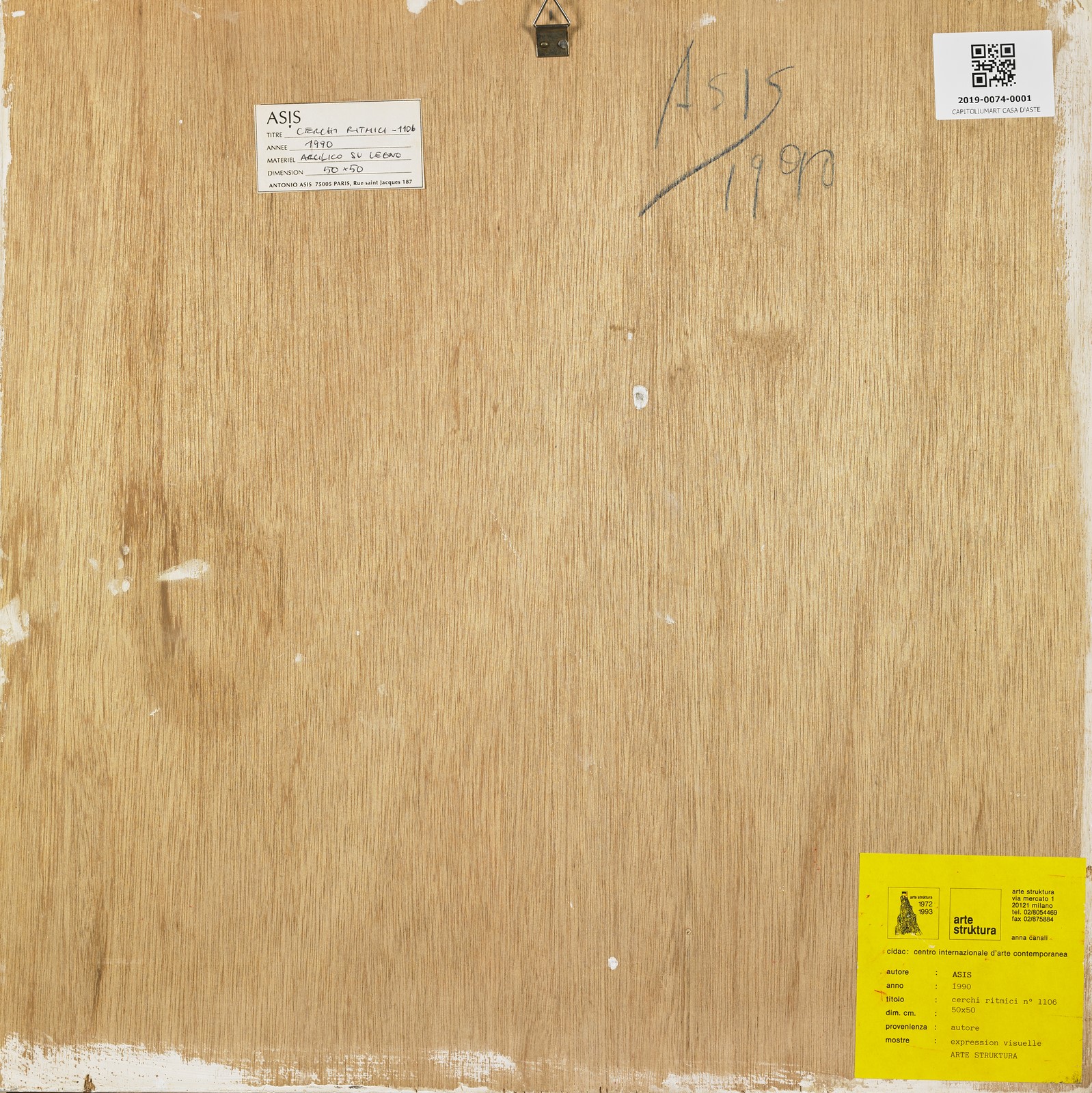 ASIS ANTONIO (n. 1932) Cerchi ritmici - 1106. 1990. Acrilico su tavola. Cm 50,00 x 50,00. Al retro firma, anno e cartiglio descrittivo Arte Struktura, Milano.