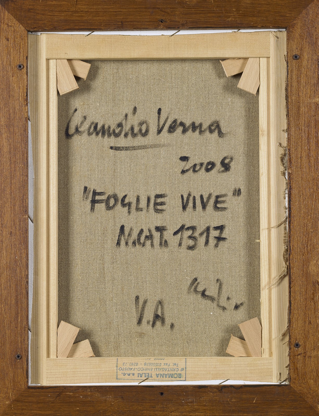 VERNA CLAUDIO (n. 1937) Foglie vive. 2008. Acrilico su tela. Cm 30,00 x 40,00. Al retro titolo, firma e anno. Pubblicazione: Claudio Verna, Catalogo ragionato, a cura di V. W. Feierabend e M. Meneguzzo, Fondazione VAF, Silvana Editoriale, Cinisello Balsamo (Mi), 2010, pag. 485. Sitografia: http://www.claudioverna.it/dipinti/2004-2008/nggallery/image/1168 . Provenienza: Collezione Maurizio Cesarini, Senigallia. Cornice presente