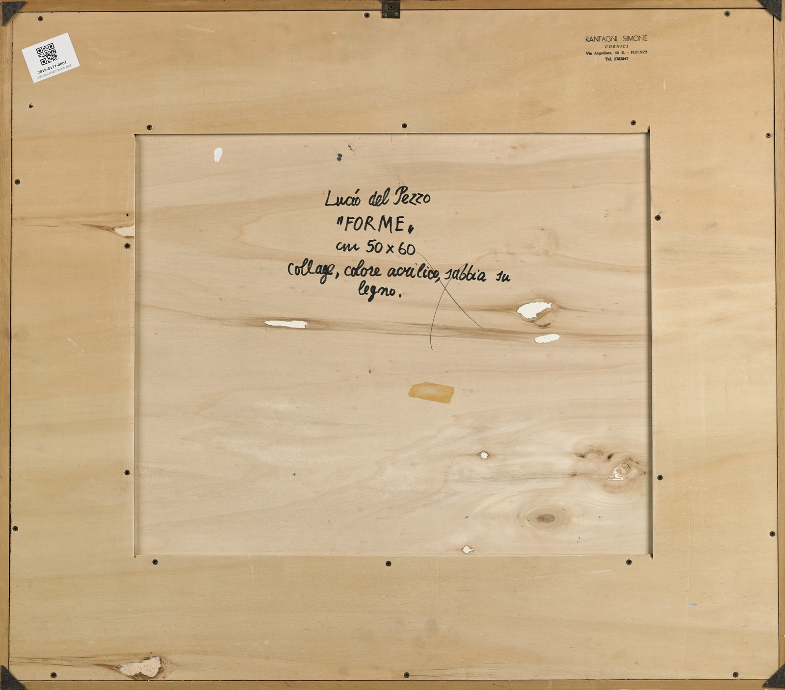 DEL PEZZO LUCIO (n. 1933) Forms. Mixed media on wood. Cm 60,00 x 50,00. Signature lower centre. At the back title and signature. Artist's authenticity certificate on photo. Cornice presente
