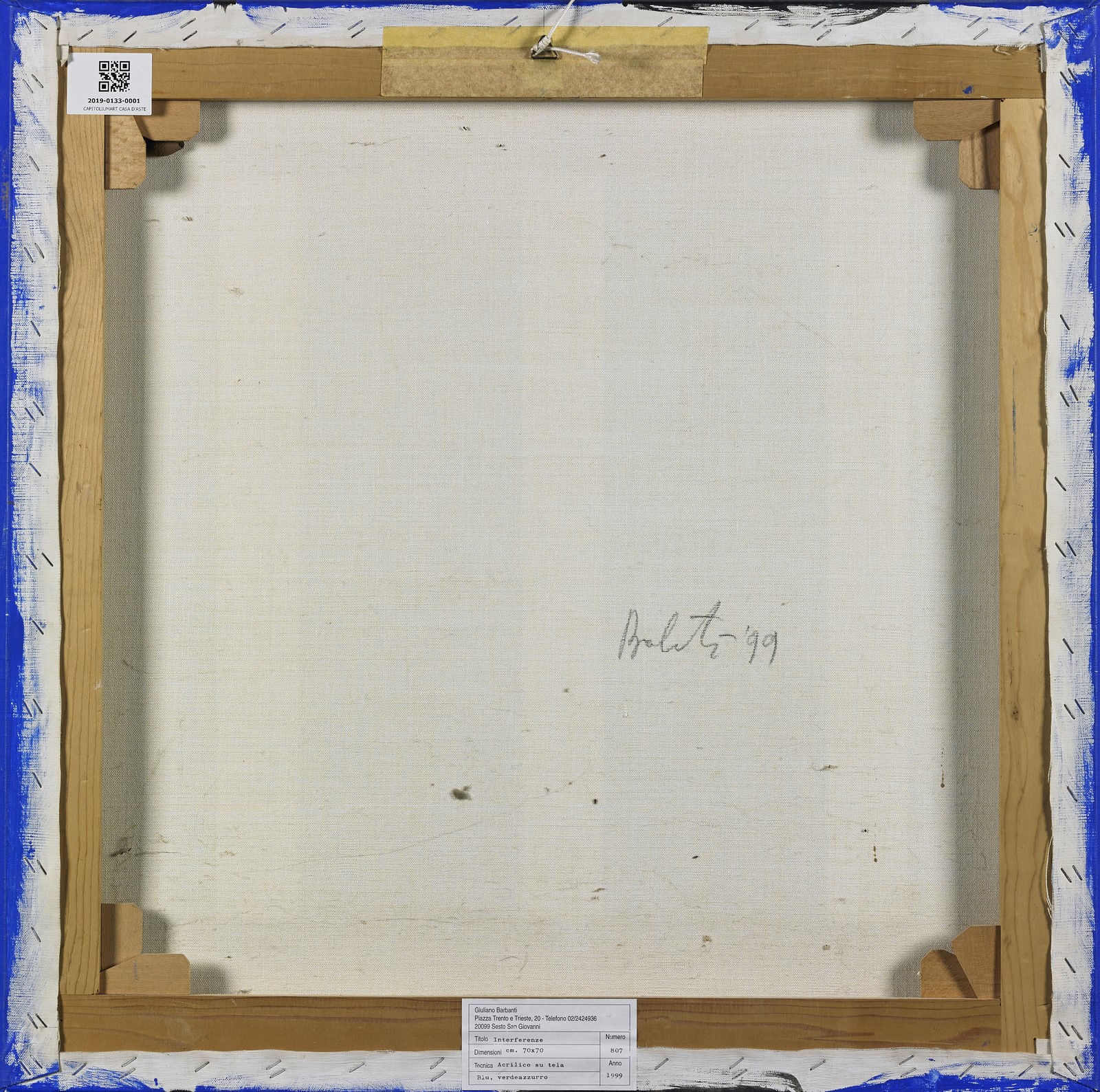 BARBANTI GIULIANO (n. 1936) Interferences. 1999. Acrylic on canvas. Cm 70,00 x 70,00. Signature, date and artist's label at the back. Littele defects.