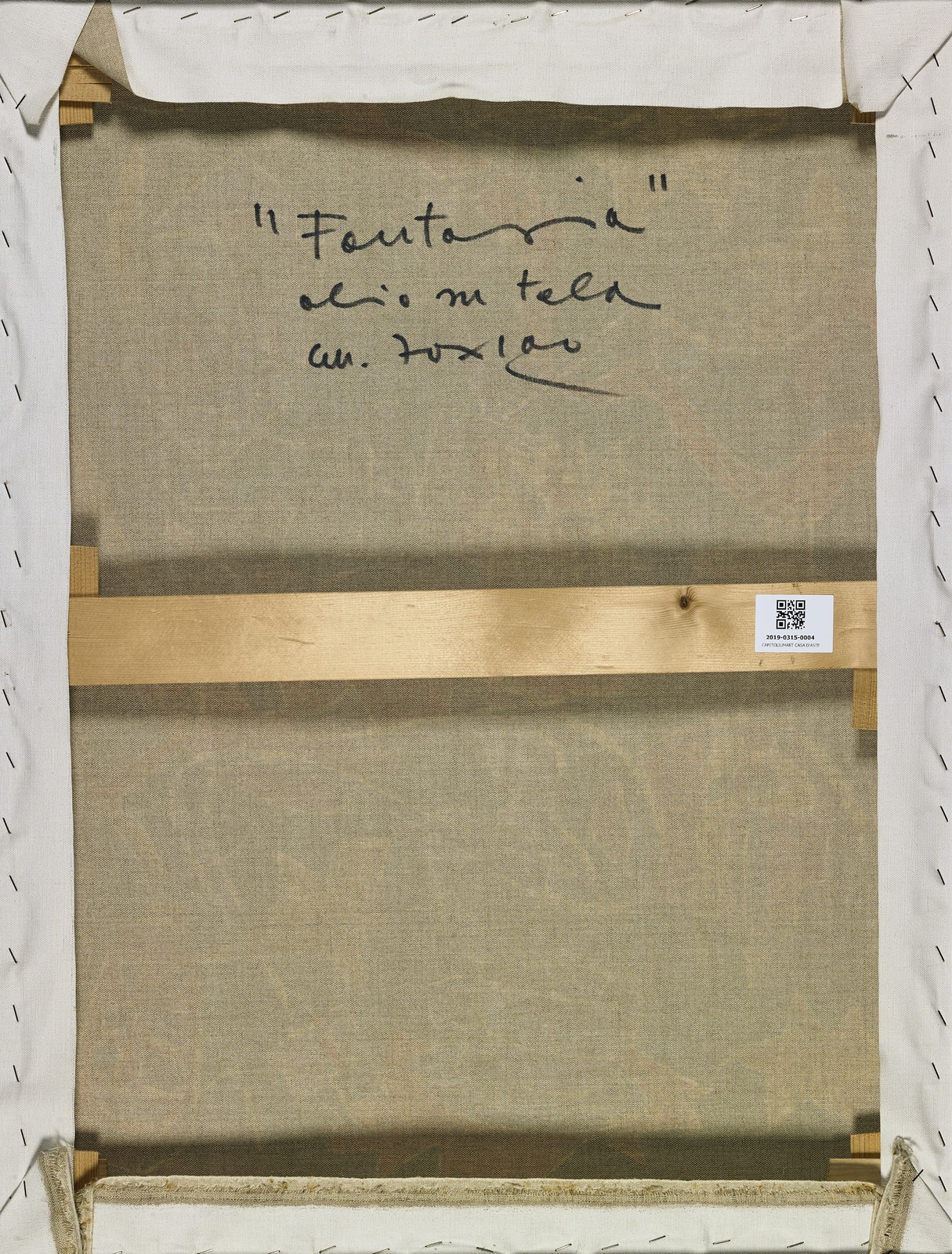 NESPOLO UGO (n. 1941) Fantasia. Acrilico su tela. Cm 70,00 x 100,00. Firma in basso a destra. Titolo al retro. Autentica dell'artista su fotografia. Cornice presente