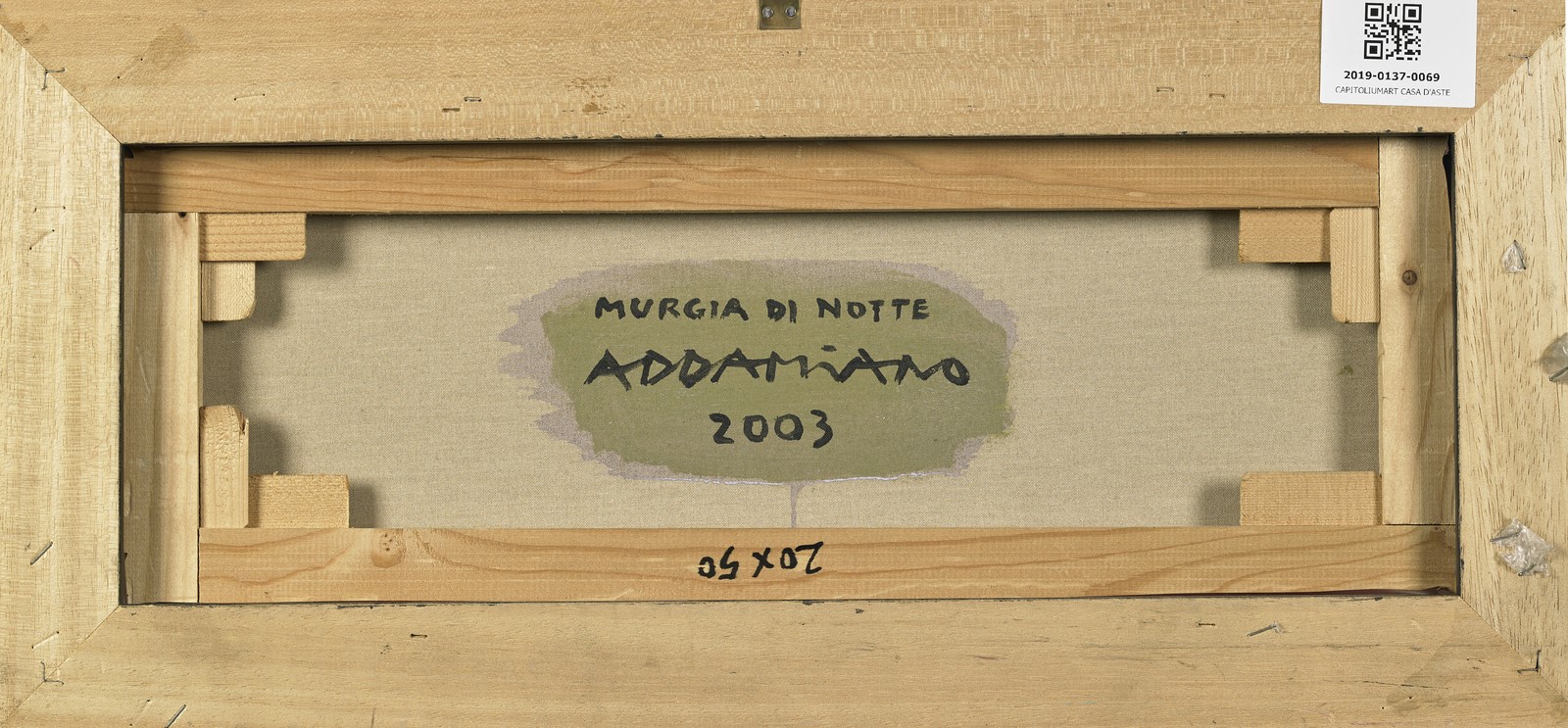 ADDAMIANO NATALE (n. 1943) Murgia di notte. 2003. Acrilico su tela. Cm 50,00 x 20,00. Firma in basso a sinistra. Al retro titolo, firma e anno. Autentica dell'artista su fotografia. Lievi difetti. Cornice presente