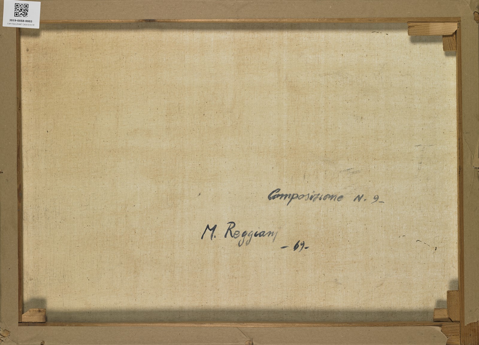 REGGIANI MAURO (1897 - 1980) Composizione n.9. 1969. Acrilico su tela. Cm 70,00 x 50,00. Al retro titolo, firma e anno.Opera archiviata presso l'Archivio Mauro Reggiani, Milano come da documentazione fotografica allegata all'opera riportante il relativo numero d'inventario. Cornice presente