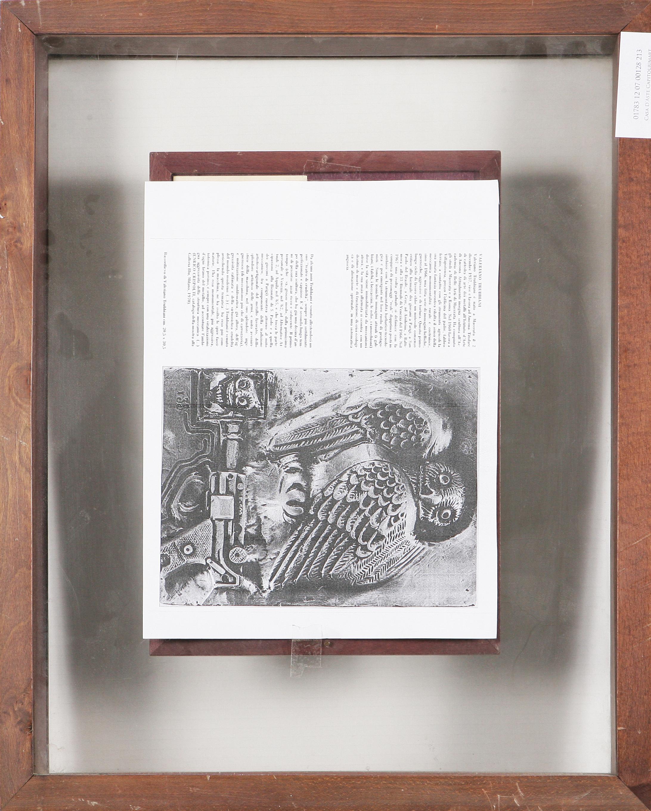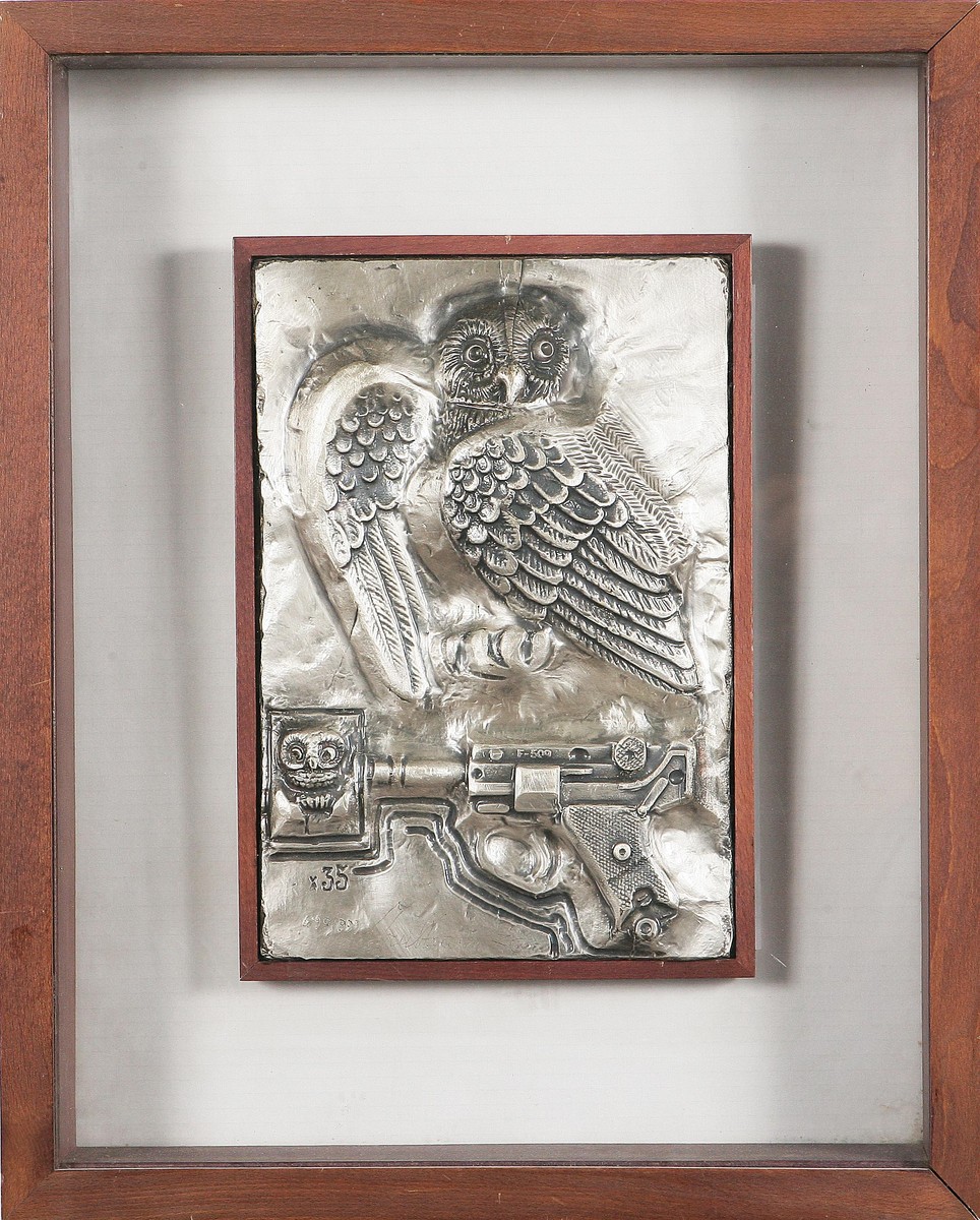 TRUBBIANI VALERIANO (n. 1937) Puntare il bersaglio. 1976. Bassorilievo in metallo. Cm 20,5x30,7. Tir. 499/990, entro teca di legno e vetro.. Al retro cartiglio descrittivo di Sterling Italiana di Pollenza (MC). Firma e data in basso al centro. Cornice presente.