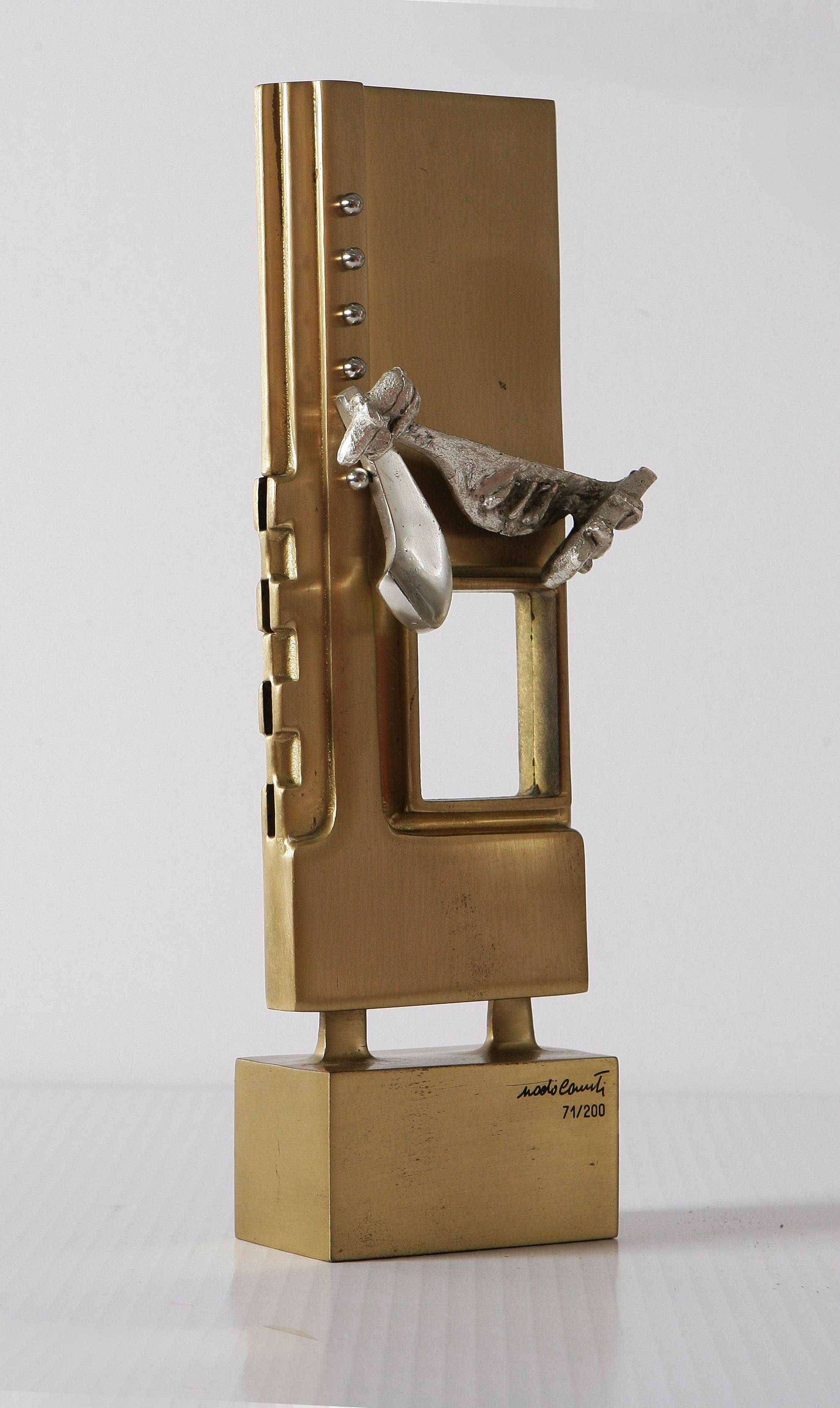 CANUTI NADO (n. 1929) Onirogramma 1 (Tipo A). 1971. Metallo e bronzo. Cm 15x23x6. Opera pubblicata sul volume (allegato all'opera) -Nado Canuti, Onirogrammi- Edizioni Bora, BO. Tir. 71/200. Scultura multipla prodotta in 200 esemplari numerati e firmati, costituita da: corpo e base in lega -delta verde- di colore giallo oro satinato e zappinato a fuoco; figura in bronzo argentato. Firma e tiratura incisi sulla base.
