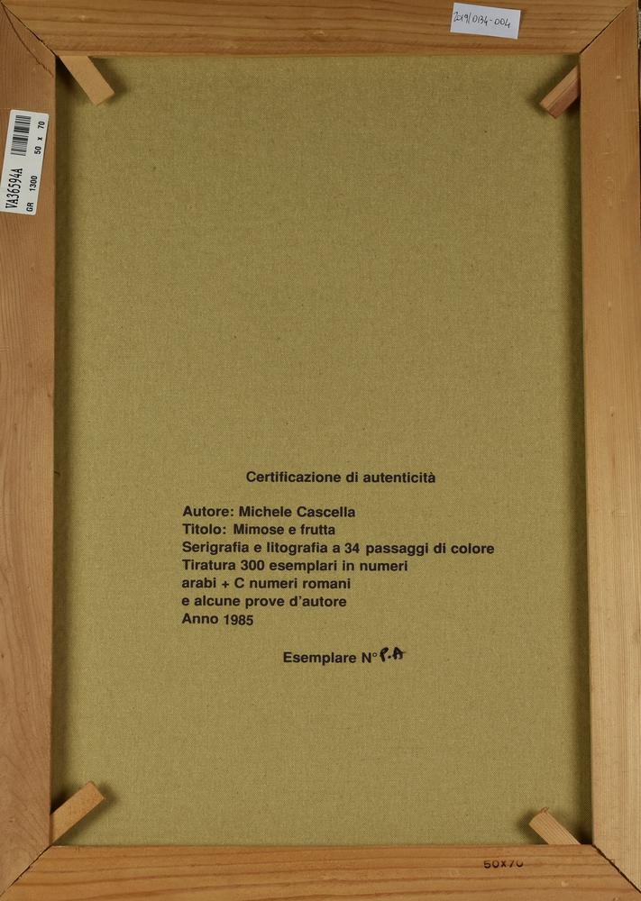 Michele Cascella MIMOSE E FRUTTA serigrafia a colori su tela, cm 70x50 esemplare P.A. sul fronte: firma eseguito nel 1985