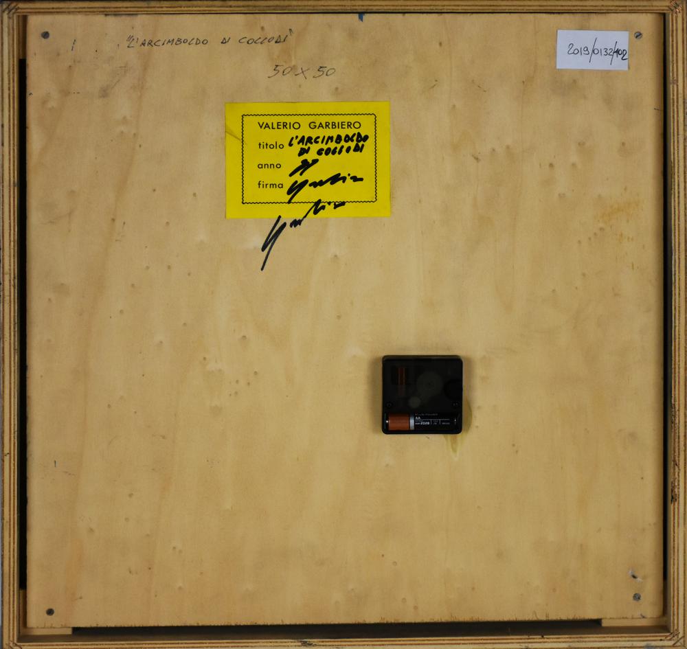 Valerio Garbiero L'ARCIMBOLDO DI COLLODI tecnica mista su compensato con meccanismo di orologio (non funzionante), cm 50x50x3,8 sul retro: firma, titolo e data eseguita nel 1987