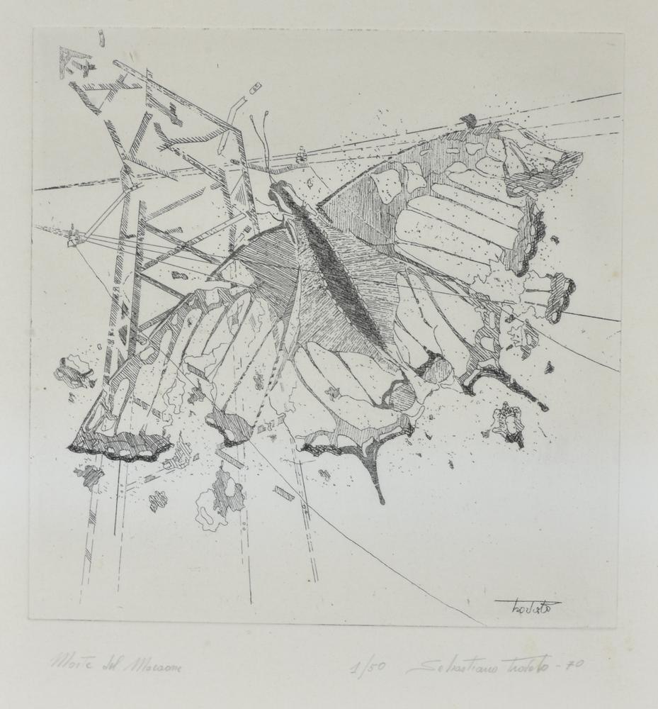 Sebastiano Trovato MORTE DEL MACAONE incisione su carta, cm 31x29 (lastra cm 24,5x25) esemplare 1 su 50 sul fronte: firma e data eseguita nel 1970