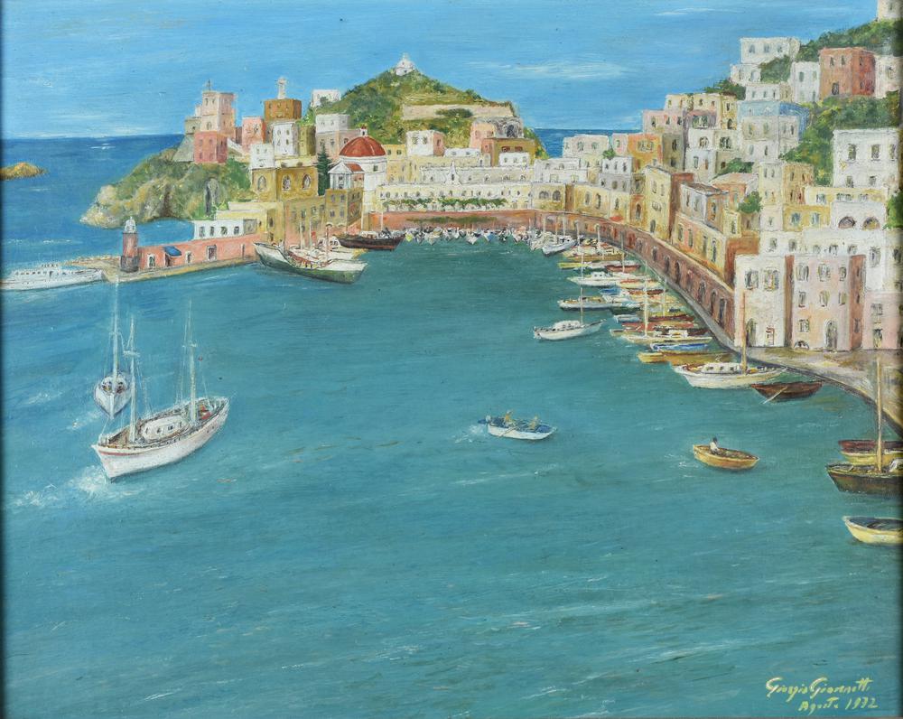 Giorgio Giannotti IL PORTICCIOLO DI PONZA olio su tavola, cm 39,5x50 sul fronte: firma e data sul retro: firma, titolo e data eseguito nel 1972
