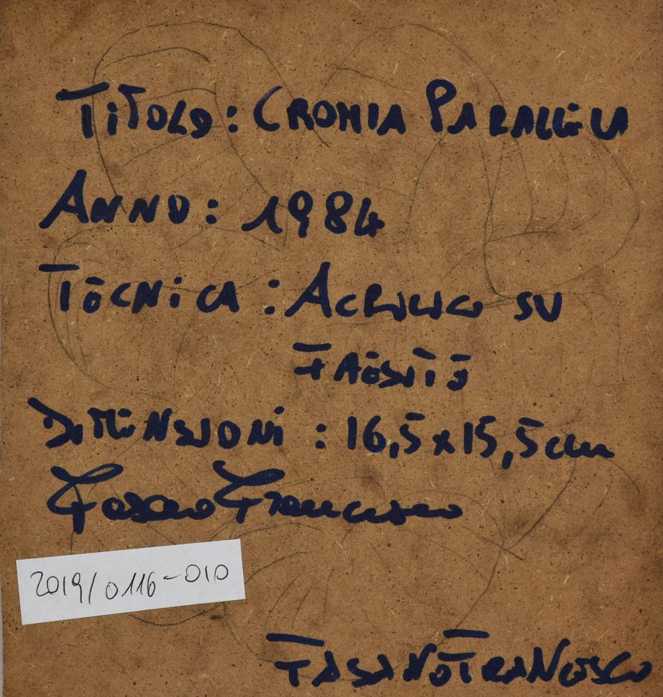 Francesco Fasano CROMIA PARALLELA acrilici su faesite, cm 16,5x15,5 sul retro: titolo, firma e data eseguito nel 1984